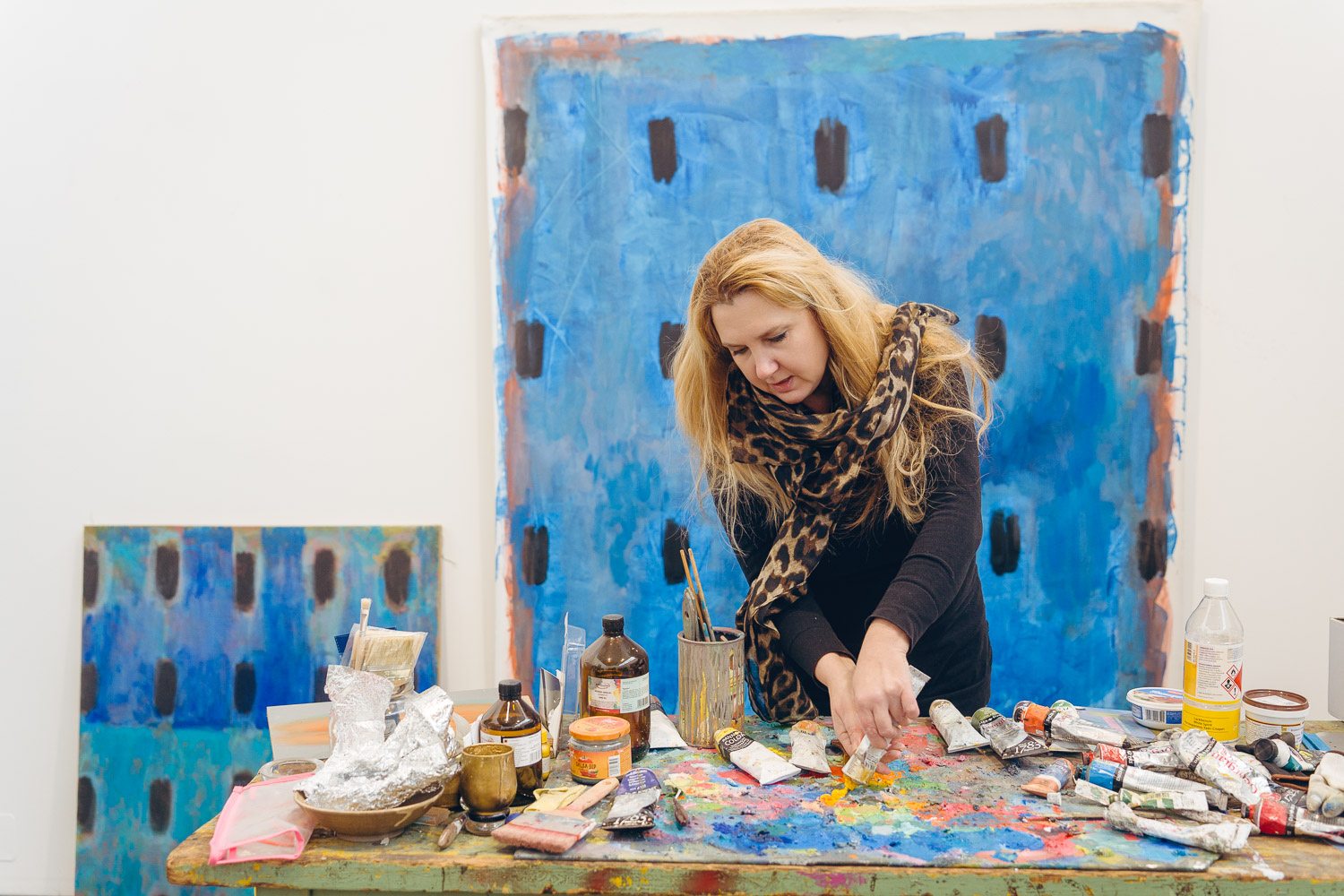 „Vékony, lazúros rétegekkel dolgozom – kezdetben praktikus okból használtam így az olajat, hogy a festék gyorsabban száradjon, később azonban tudatos festői döntésként. A felület így nem nehezedik el, hanem levegős, átjárható marad; a rétegek nem fedik el egymást, hanem finoman reagálnak egymásra.” A háttér sem puszta díszlet tehát: érzékenyen épített festői tér, amelyben az ecsetnyomok már önmagukban is irányokat, feszültségeket, ritmusokat hoznak létre.