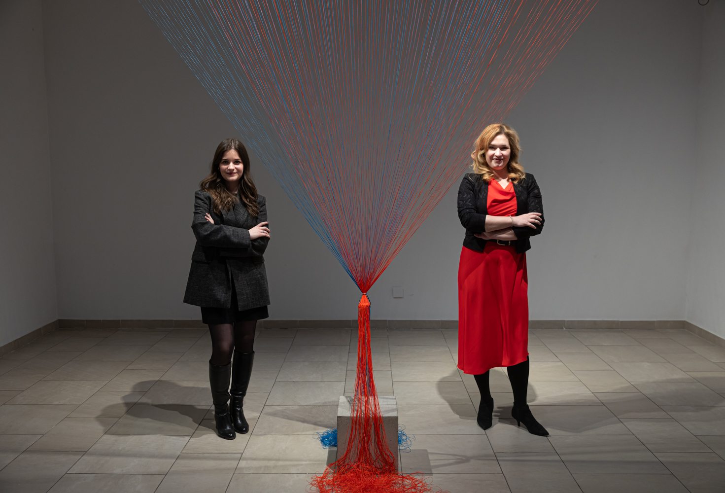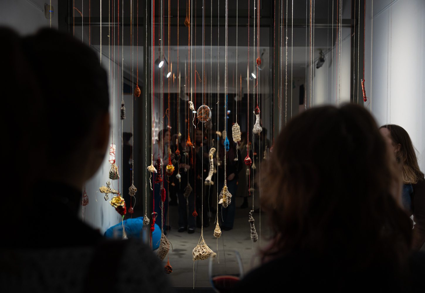 J. N.: A hátsó folyosón például Németh Sára installációja jelenik meg, amelynek alapgondolata, hogy mindannyian kis szigetek vagyunk, és a köztünk feszülő szálak, kapcsolati hálók teszik egésszé az életünket. Ezt a motívumot mi is nagyon fontosnak tartottuk: hogy az örökölt minták nemcsak bennünk, hanem a közöttünk lévő viszonyokban is kirajzolódnak.