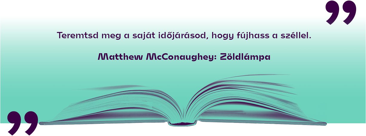 „Matthew McConaughey Zöldlámpa című önéletrajzi könyve egyrészt azért volt rám nagy hatással, mert jó érzés volt szembesülni McConaughey nagymértékű önazonosságával, másrészt azért, mert szép tükör. Az élet nagyon sok jelzést küld nekünk – piros, sárga és zöld lámpákat –, és a megfelelő hozzáállással mindent át lehet vészelni. Felidézek egy szimbolikus történetet: amikor felköltöztem Pestre, utáltam autót vezetni. Stresszeltem az utakon, mert nem tudtam, hol kell letérni, lefordulni stb. Egy alkalommal bent voltam a városban, piros lámpát kaptam. Én voltam a sor elején. A GPS azt mondta, hogy forduljak balra, de nem volt balra vezető út. Szorongtam a helyzetben. Fogalmam sem volt, mitévő legyek, merre menjek, és attól tartottam, hogy miután zöldre vált a lámpa, a mögöttem lévő hosszú sor türelmetlenül dudálni fog. Egy ponton azonban realizáltam, hogy választhatok: szoronghatok, ezzel már-már kést döfve magamba, vagy félredobhatom az aggodalmam, megállva és megpihenve a piros lámpa ideje alatt. Míg tart a piros, kitekinthetek az autóból, és stresszelés helyett megélhetem a jelenlétet, figyelhetem a helyzetet. Így, mikor zöldre vált a lámpa, úgy indulhatok el, hogy a jelenben, higgadtan mérem fel a lehetőségeket. Ha nincs balra vezető út, akkor „itt és most”, a középpontommal kapcsolódva – ezáltal tiszta szemmel látva – a lehetőségeimhez mérten oldom meg a helyzetet.”