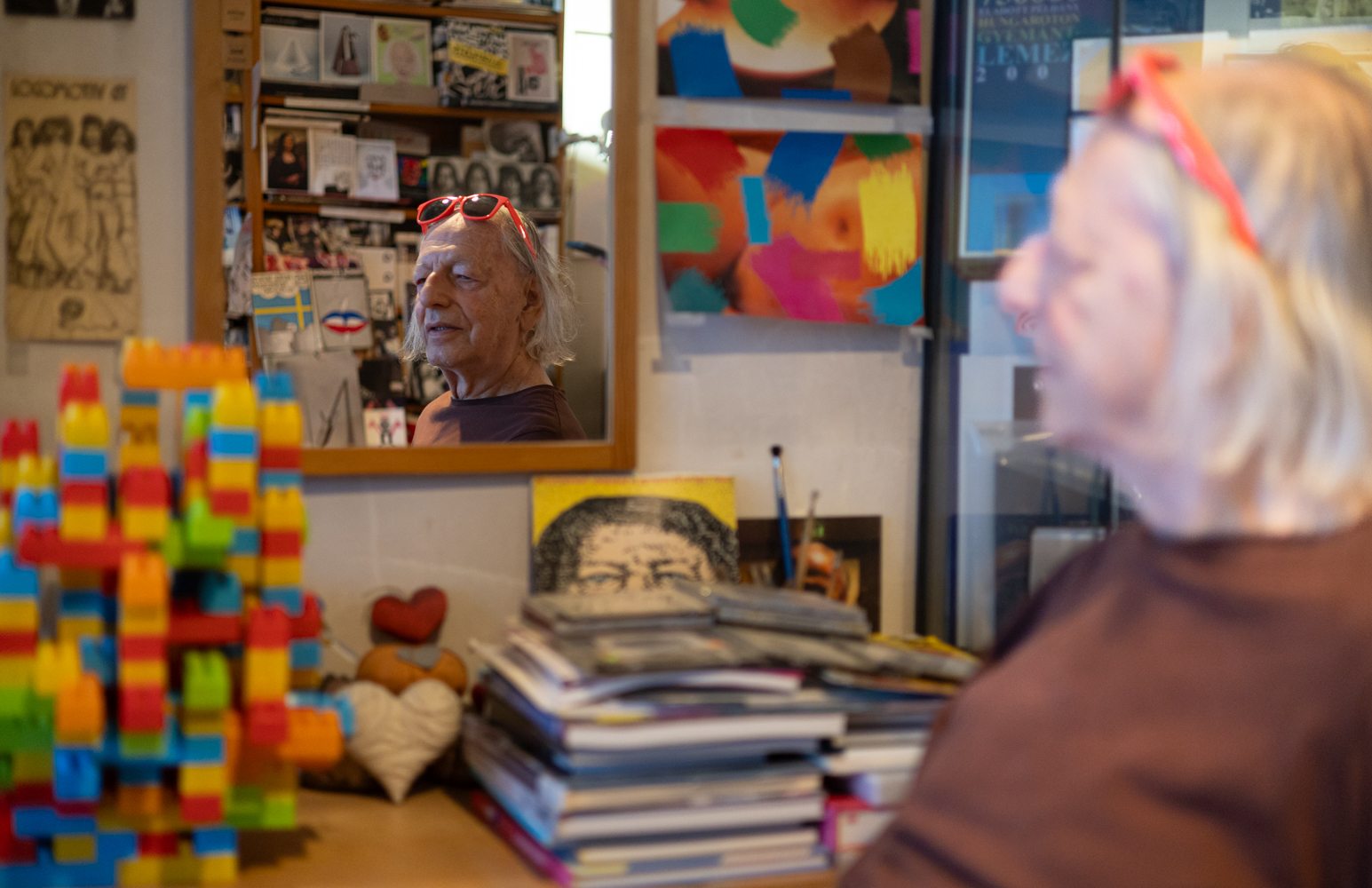 A számítógépén nézegetjük az egyes sorozatokat, közben világossá válik az is, hogy a digitális világ felé vezető nyitottsága nem egyszerű technikai érdeklődés, hanem kíváncsiság az egész jelen iránt. Ez vezeti most a mesterséges intelligencia felé is. Az új eszközöket nem fenyegetésként, hanem lehetőségként látja. Ahogy a kilencvenes években a komputer, úgy ma az AI sem idegen számára: „Ez nem új művészeti ág. Ez egy újabb eszköz.”