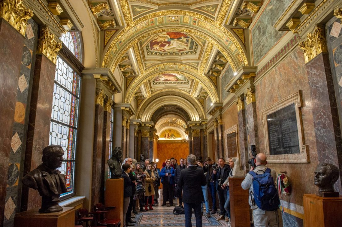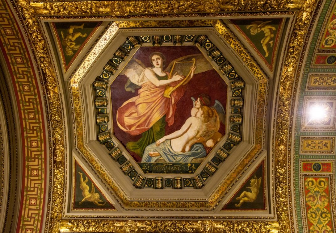 A folyosóra érve a historizáló üvegablakokon akad meg a szemünk, amelyeket Róth Miksa édesapja, Róth Zsigmond tervezett. A séta művészettörténésze, Bojtos Anikó beavat bennünket a mennyezetfreskók szimbolikájába. Lotz nyolcszögű képterekben négy olyan fogalmat: az összhangot, a szépséget, a valóságot és képzeletet jelenítette meg, amelyek a kor felfogása szerint elengedhetetlennek számítottak egy jó mű léttrejöttéhez.