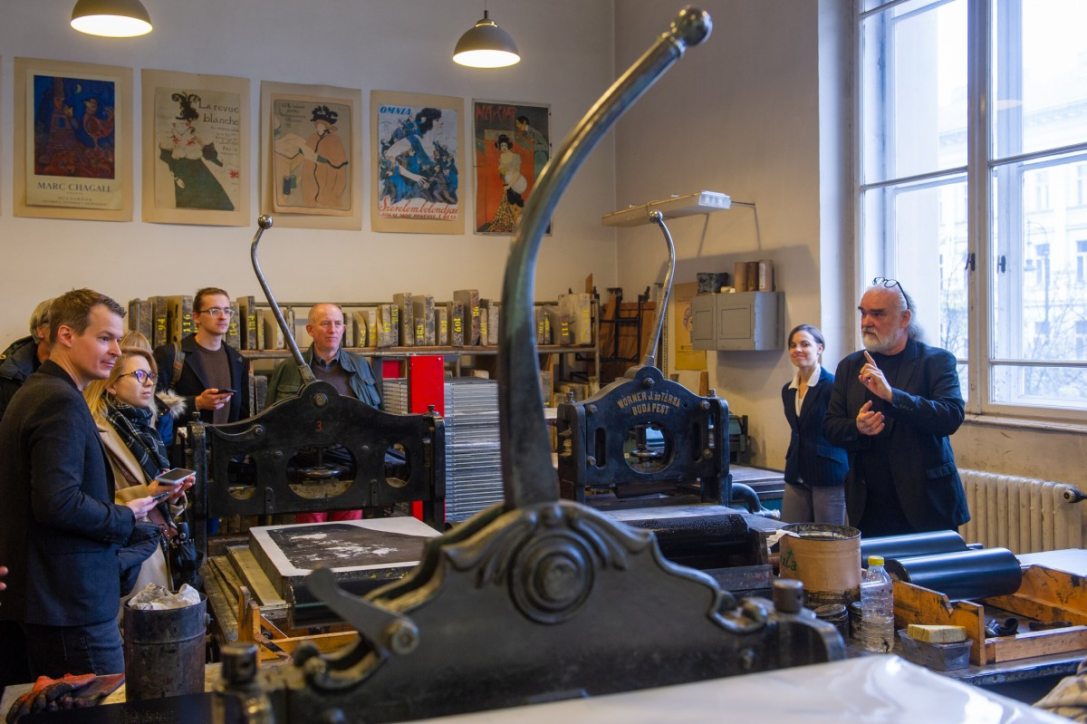 A műhelyekben beleshetünk a kulisszák mögé. Az egyik teremben épp szitanyomat készül, egy másikban litográfia, a következőben linómetszet.