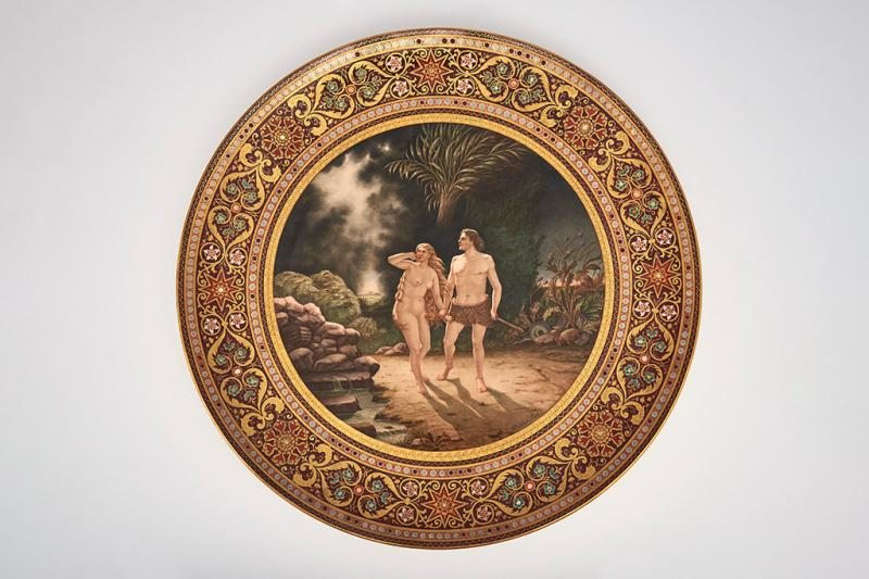 Ezt az átmenetiséget, ég és föld közötti állapotokat jelképezik a kerti jelenetek, az iparművészeti tárgyak díszítőelemei is. Leggyakrabban a bűnbeesésre utalnak, mint az Iparrajziskola egykori tanára, Müller (Molnár) Pál fentebb látható, keleties kerettel díszített, barokkos kerámiaképén, de a mitikus világképek leggyakoribb motívuma, az életfa is tulajdonképpen ilyen köztes állapotot idéző, kerti kép.