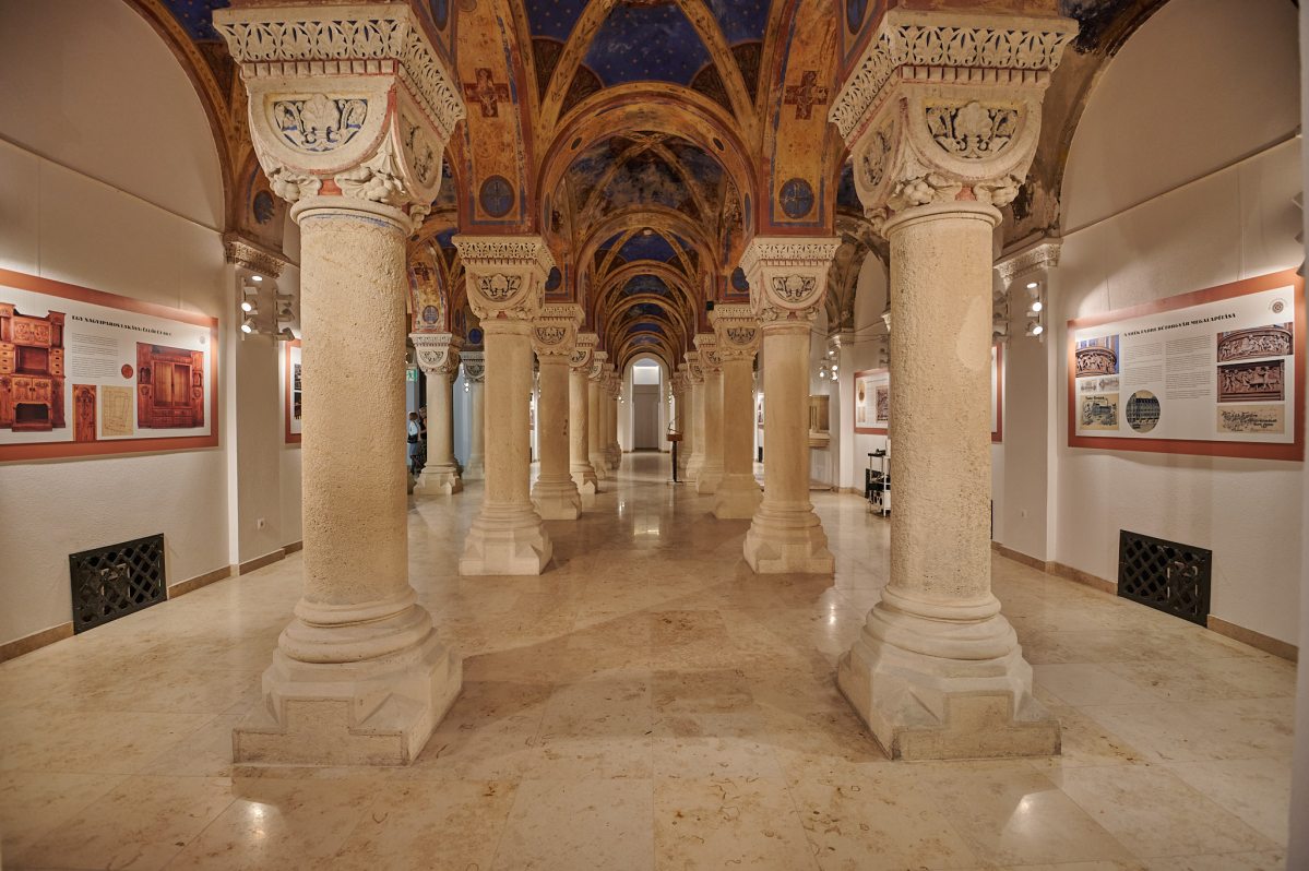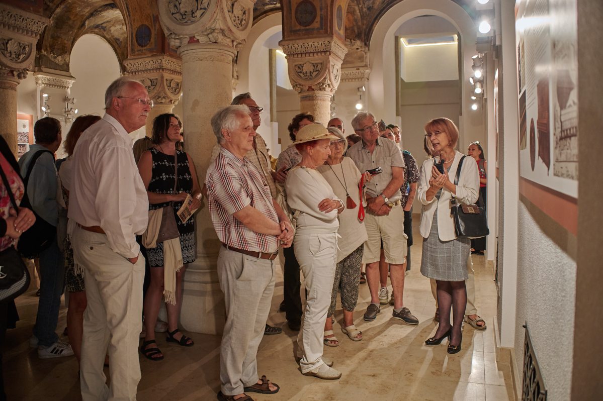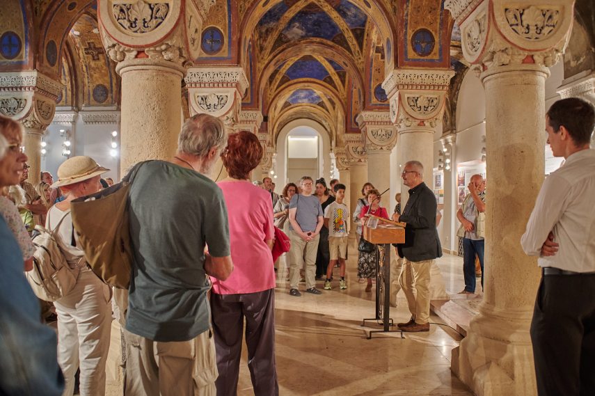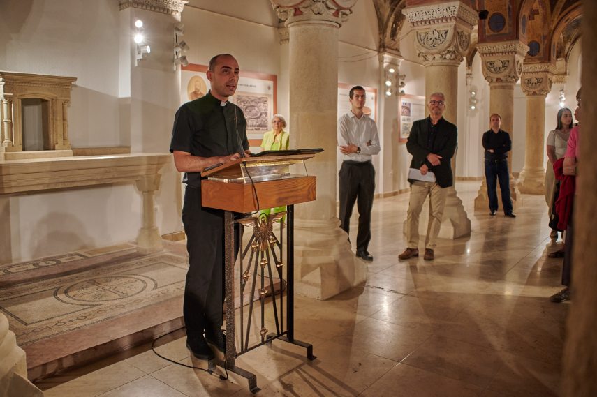 A gyönyörűen felújított, színes oszlopfőkkel díszített neoromán stílusú altemplomban tartott csütörtök esti kiállításmegnyitón először Michèle Baggi beszélt a megjelentekhez. A plébániakormányzó megemlítette, hogy a Bakáts téri templomban, melynek épületét Ybl Miklós tervezte, többek között a padok és a gyóntatószékek is Than Károly bútorgyárának remekei.