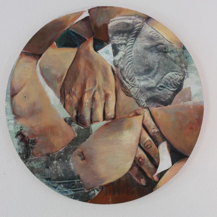 A Töredékek című kompozíció tondóformába helyezett képmozaik, amelyen archaikus képelemekkel keverednek a művész önábrázolásának részletei. A kör alapforma már önmagában is ókori és reneszánsz művészeti korszakokra utal. A kiragadott kőszobor és az emberi test elemeinek darabkái egységet alkotnak. A festményen összemosódik a múlt és a jelen, a női és a férfi princípiumok. Verebics Katalin az utóbbi években visszatérően foglalja kompozícióiba múzeumi élményeit, amelyek sajátos emberitest-ábrázolásaival kapcsolódnak össze.