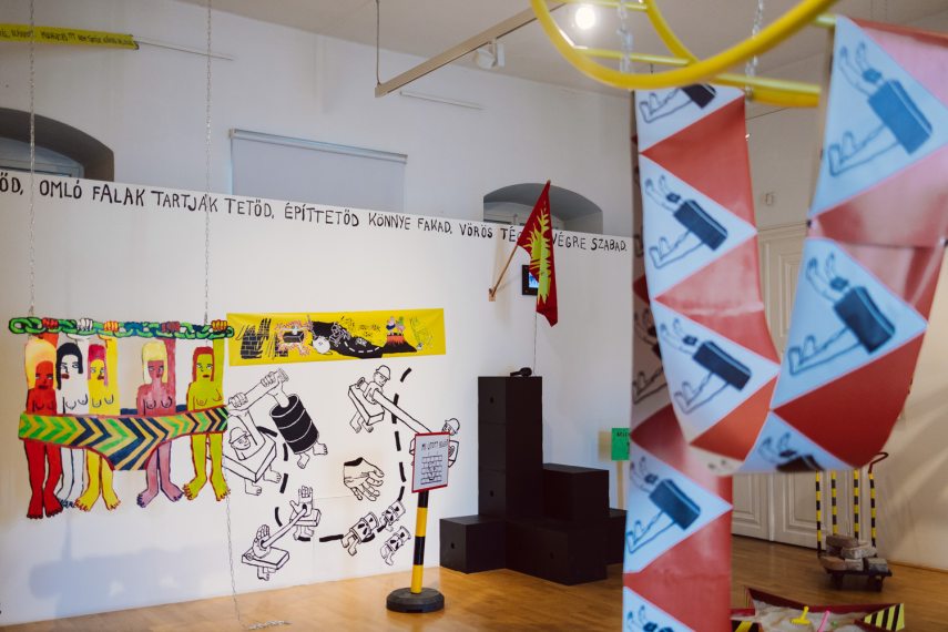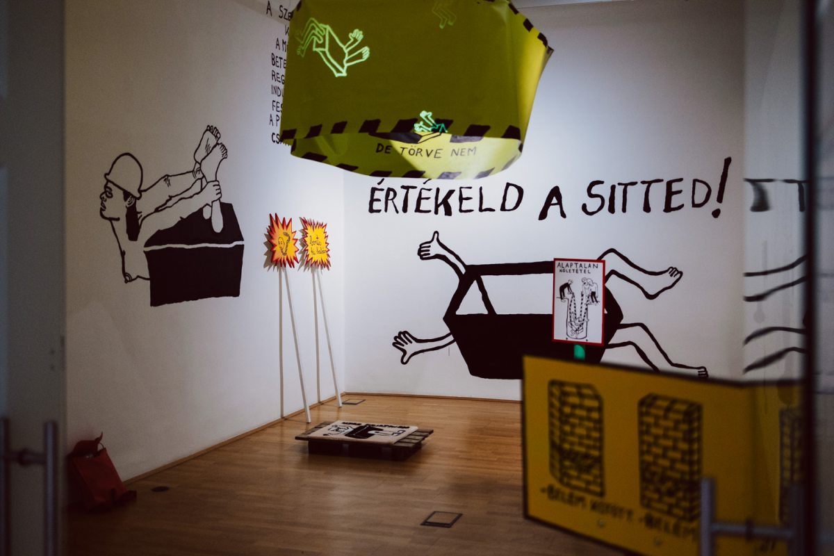 A szövegeim olykor karcosabbak, a Téglakarcsujogató talán lágyít rajtuk. Ezek köztéri akciókon, performanszokon hangzottak el, és a dokumentációik láthatók a videókon. Az egyik munkavédelmi sisakban is meg lehet hallgatni egy közösen írt dalt, de van egy munka, amelyen egy ringatót énekelünk. Úgy gondolom, hogy sötét tartalmak felszakadását követően a gyógyító figyelemnek teret kell adni, a ringatás gesztusa is jelen kell hogy legyen, ahogy azt az előbb is említettem. A falakra a rapszövegeim részletei vannak felfestve, a műveken pedig szlogenszerűen megjelenő, gyakran viccekkel operáló sorok vannak, így a néző több szinten tud bevonódni ebbe a térbe. Ezenfelül a kiállításhoz tartozik egy vezető is, ami segítséget kínál a legtöbb elem értelmezéséhez, ha a látogatók túlságosan elveszetten éreznék magukat ezen a játszótéren.