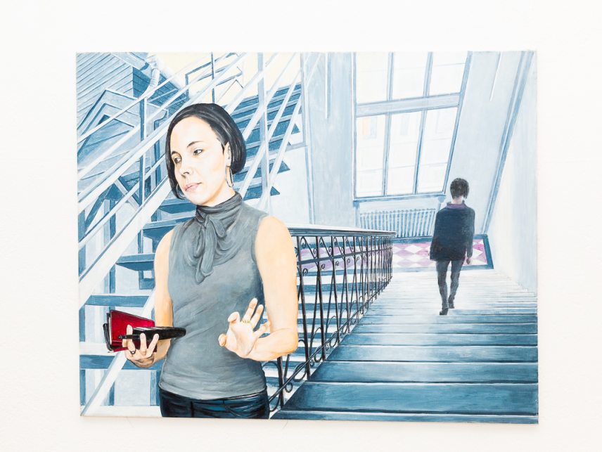 Nagyon izgalmas például az a munkája, amelyen a kedves egy lépcsőház fordulójában jelenik meg kétszer: felfelé haladva és lefelé lépdelve. A kép a párhuzamos és merőleges vonalaknak köszönhetően elképesztően mozgalmas, az éles szögekben záródó vonalak konstruktivista hatásúak, és izgalmasan ellenpontozzák az előtérben látható figura plasztikusságát.