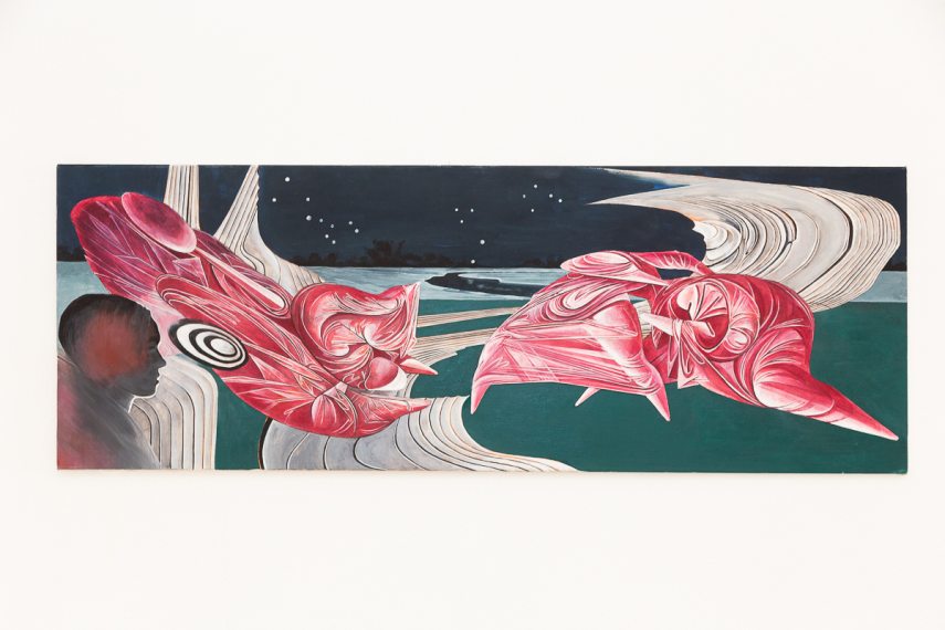 A ciklus legkorábbi darabján megjelenő formák drapériával betekert, szakrális alakoknak tűnnek, ám kicsavart testhelyzetük, amorf mivoltuk miatt egészen groteszknek hatnak. A geometrikus formákká absztrahált tér, amiben állnak, kozmikus dimenzióval gazdagodik. Hasonlóan a mellette szereplő képhez, amelynek formái űrhajókat idéznek.