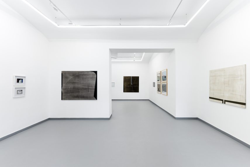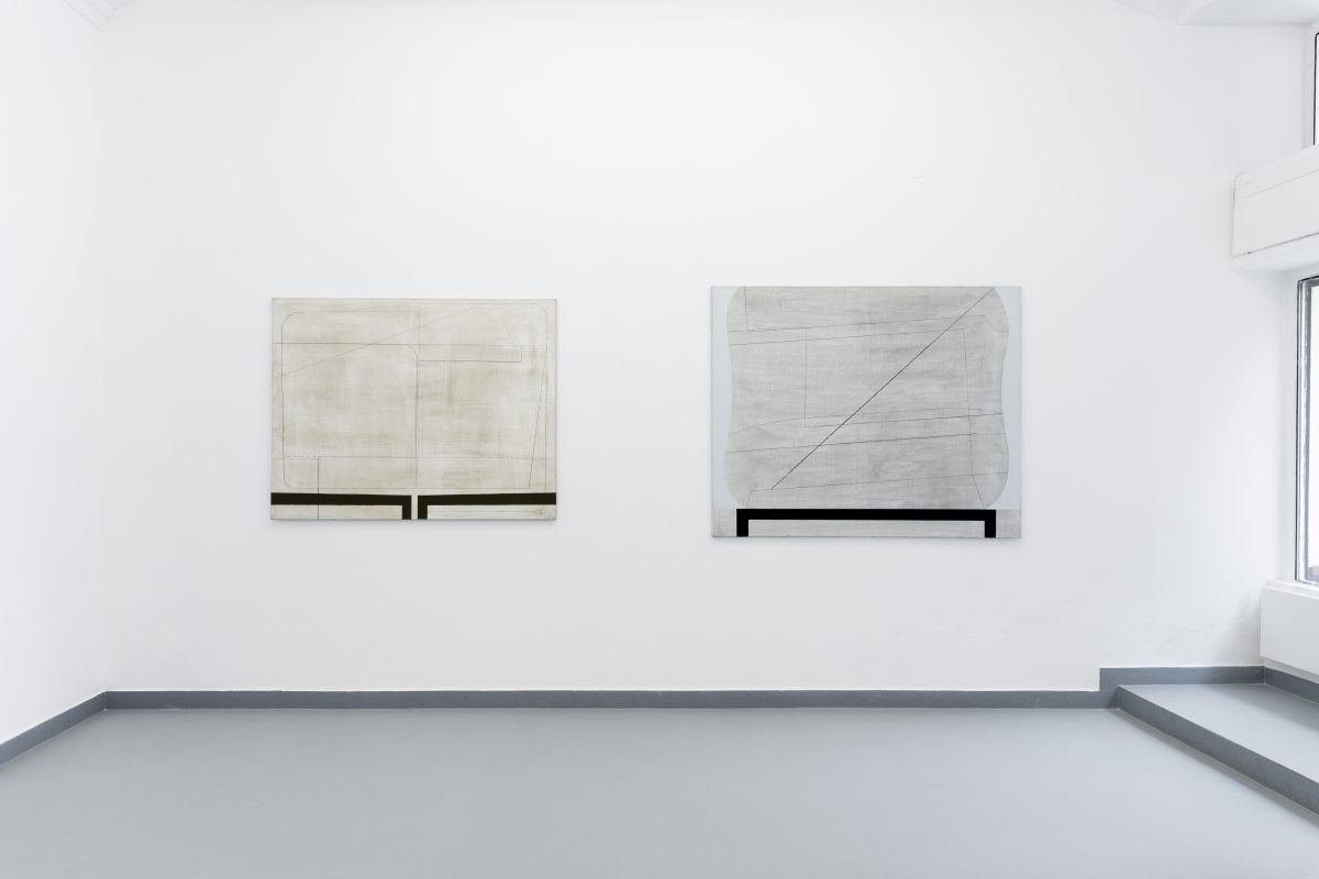 A nagy táblákon különféle minőségű felületek találkoznak, az alsó rétegben puhán felvitt gesztusok jelennek meg, amelyek egyszer kifutnak a kép széléig, máskor pedig hullámzó, organikus keretek közé vannak zárva. Erre kerülnek fel aztán a vonalak, amelyek mindig kijelölnek egy teret, a lét határait, s ezeken belül a művész struktúrába rendez. A tárlaton az alkotó kollázsai és intim festményei közül is láthatunk néhányat, amelyek sokkal kaotikusabbak vagy sűrűbbek, kavargók és bizonyos szempontból melankolikusabbak is. A szabadság és a korlátok közötti létezés mérkőzik meg egymással ezeken a képeken.