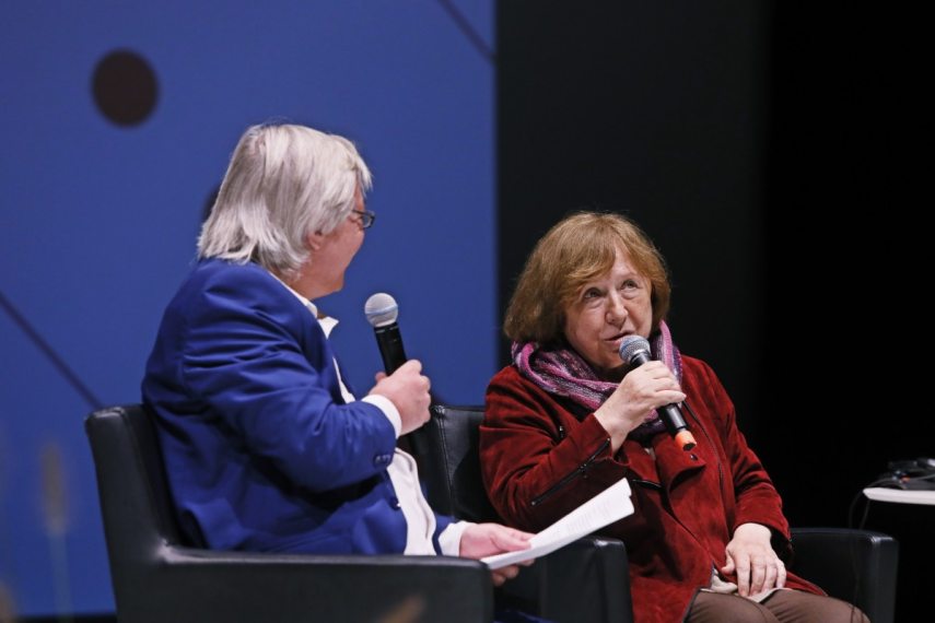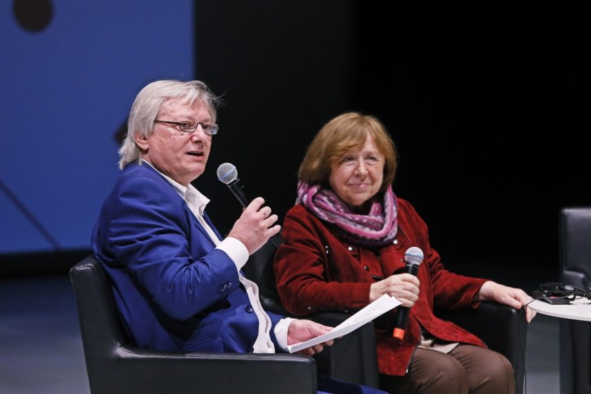 „Ami ma Oroszországban történik, azt fasizmusnak tekintem, és diktatúra van hazámban, Fehéroroszországban is. Putyin nélkül már legyőztük volna Lukasenkát, de az orosz elnök támogatásával eddig ez nem sikerülhetett” – hangsúlyozta az író, oknyomozó újságíró, aki dokumentarista prózájával, a női látásmódnak a történelem témakörébe emelésével vált világhírűvé.