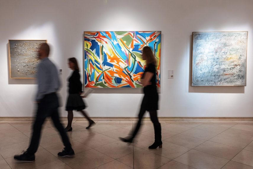 Itt van például az a Frey Krisztián-festmény, ami ötven évig rejtőzött egy másik Frey-mű mögött. A világosszürke, pasztózus „festéktestbe” belekarcolt kalligrafikus írás: számjegyek és szavak a kompozíció képalkotó elemei. Értelmük hozzáférhetetlen: ritmusuk, dinamikájuk van, és csak vizuálisan lehet őket értelmezni.