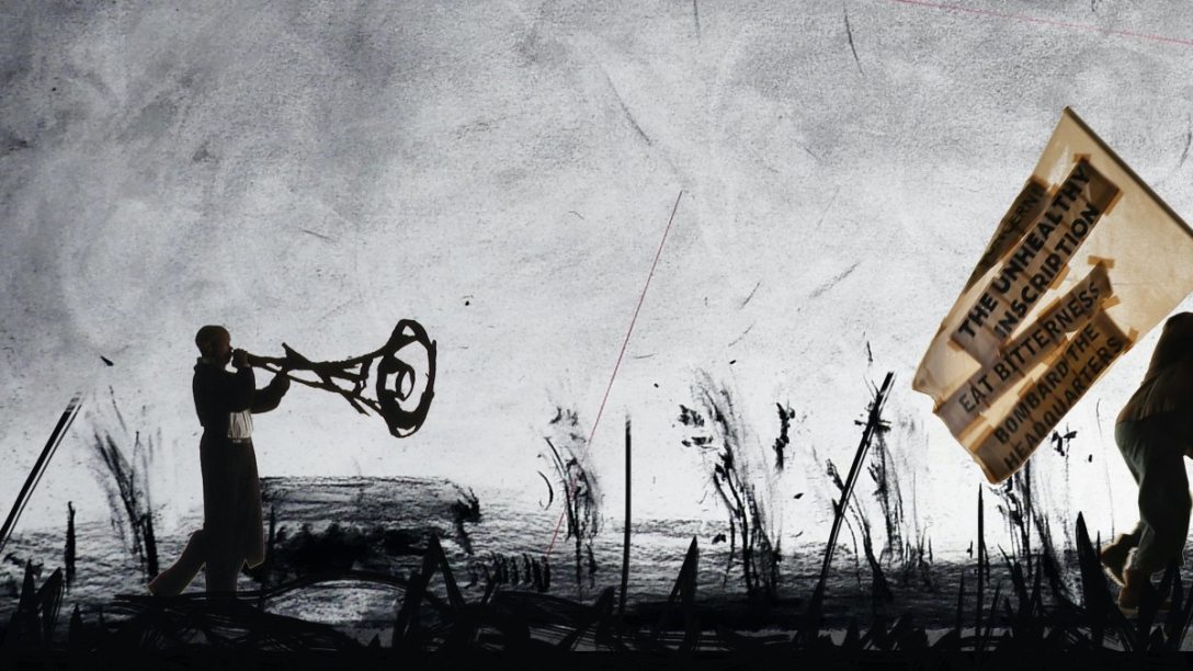 Lehet ez egy politikai menet transzparensekkel, a felbukkanó csontvázak haláltáncra utalnak, de lehet ez egy diadalmenet – akár a halál diadala is.