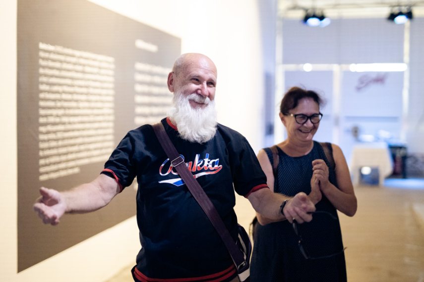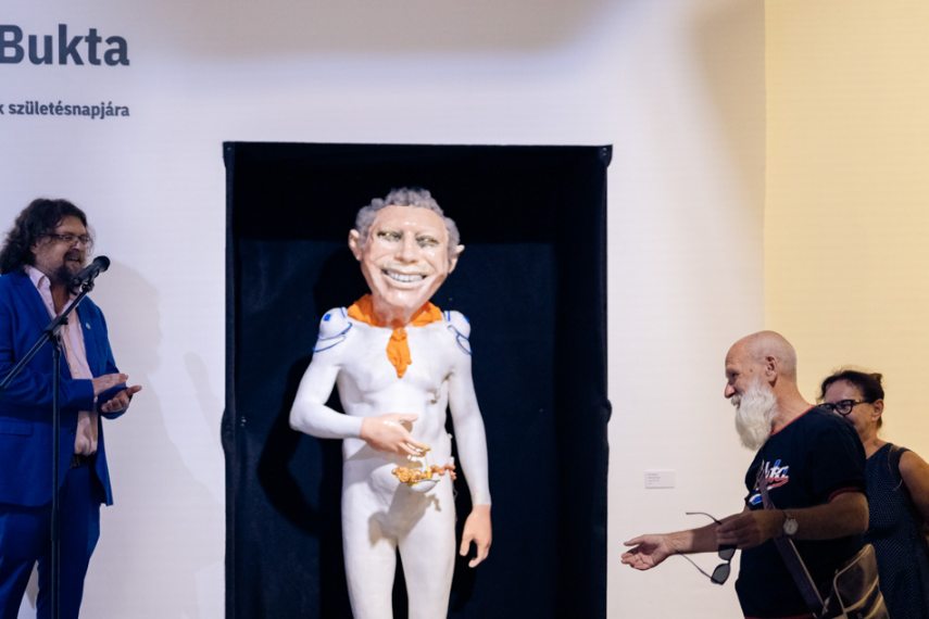 A tárlatvezetés után Bukta köszönetet mondott minden jelenlévőnek, majd hangsúlyozta: a rajta lévő, Bukta feliratú póló és táska nem kamu.