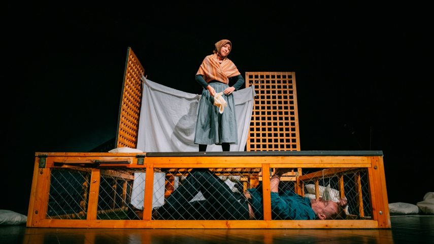 Mátravölgyi Ákos tervezővel arra törekedtek az alkotók, hogy a színpadi látvány ne illusztrálja az eseményeket, vagy azt a környezeti világot, amiben éppen játszódik, hanem saját formanyelve legyen. Ebben a történetben a lúdtollal kitömött párnák testesítik meg ezt a motívumot. Még egy fontos eleme van a térnek, egy színpad a színpadon, ami olyan, mint egy ketrec. Egy ketrec, amibe baromfit zárnak, vagy adott esetben egy ludat is tarthatnának, és amihez a színpadi szituációk plusz jelentéseket, asszociációkat adnak hozzá.