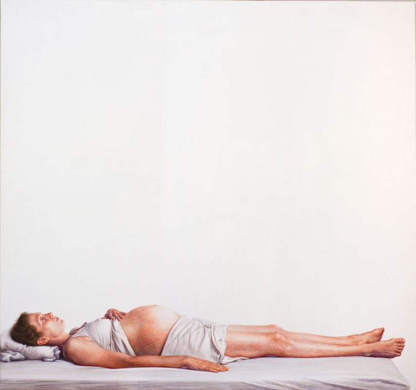 A mű egyértelmű kompozíciós és tartalmi párhuzama Hans Holbein Halott Krisztus című, pontosan ötszáz éve készült alkotásának. A reneszánsz mű zárt kompozícióba foglalja Jézus fekvő holttestét, melyet az elmúlás rideg, fekete közege hat át. Czene Márta kompozíciója pedig közvetlenül a szülés előtti test állapotát mutatja, egy teljesen nyitott, homogén fehér atmoszférába helyezve, mely az élet kiteljesedésének terét jelenti. A női test megváltozott állapotát a bőr erekkel átszőtt, életerőt sugárzó felületei, a duzzadt végtagok realista módon jelenítik meg.