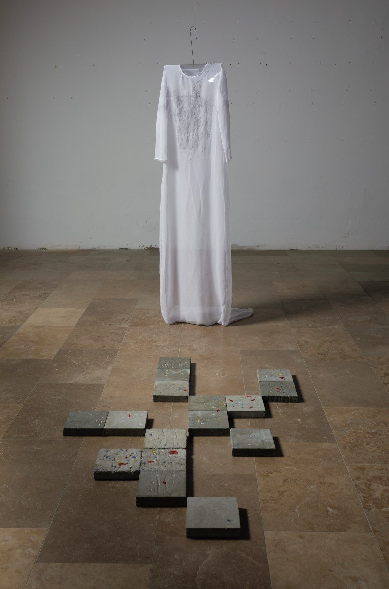 Imre Mariann installációja szintén egy tradicionális Mária-ábrázolást gondol újra. Ez pedig a vizitáció, mely során két várandós asszony, Mária és Erzsébet találkozik egymással. Mindketten tudják, hogy születendő gyermekeik kiválasztottak. Mindkettőjük megtermékenyülését szent titok övezi, tulajdonképpen az isteni akarat és cél megvalósulását jelentik. A kitörő öröm szimbolikusan árad szét a textil- és betonanyagokból összeállított kortárs műalkotáson. A hajjal hímzett fehér ruha a két asszony ölelésének nyomvonalait követi. A betonba színes fonalakkal hímzett részletek pedig MS mester vizitációkompozícióját elevenítik fel – melyen az ábrázolt virágoknak, az írisznek, rózsának fontos szimbolikus jelentései vannak. Az installáció kompozicionális elrendezése azonban több nézetben és ponton is keresztet formál, utalva ezzel a születendő gyermekek vértanúságára és áldozatára. Az ószövetségi próféciák beteljesülnek.