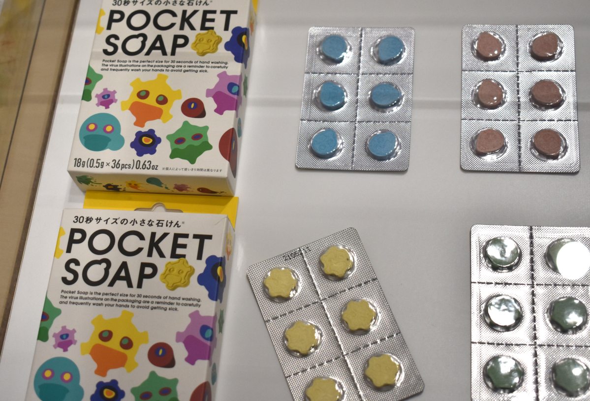 Japán a természeti katasztrófáknak erősen kitett ország, sajnos többször sújtotta földrengés, cunami: a tárlaton bemutatnak egy papírból felépíthető térelválasztó rendszert, amely a katasztrófa sújtotta területeken pillanatok alatt tud védett, elszeparált életteret biztosítani. A Covid-járvány „mellékterméke” lett a zsebszappan, a vírus formájú pasztilla, amely éppen egy kézmosásra elegendő és bárhova magával viheti az ember, akár a zsebében is.
