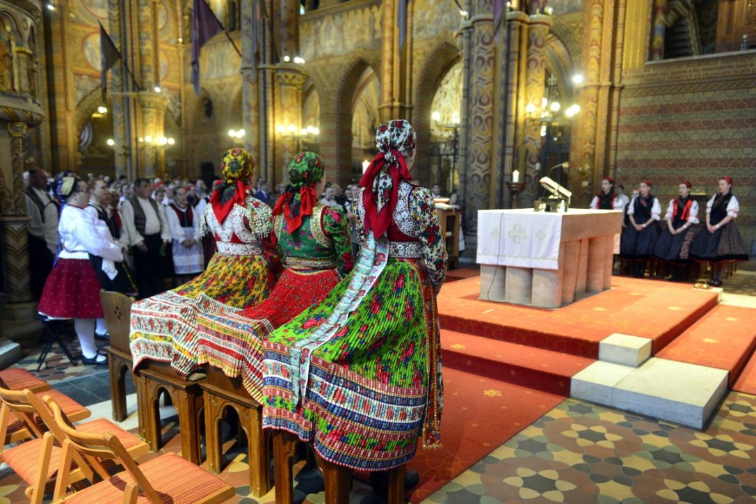 Több száz táncos látványos felvonulásával megkezdődött az első Csoóri Sándor Népművészeti Fesztivál Budapesten, a Szentháromság téren.