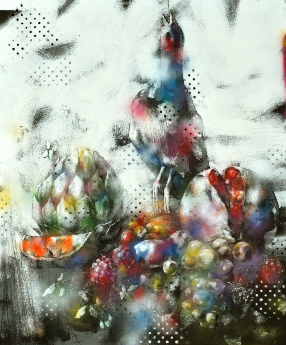 Ma már Lázár Tibor bizarr portréin nőket látunk, aktokat furcsa háziállatokkal, késekkel vagy épp bogarakat falatozva, pink sérülésekkel vagy glóriával. Csendéletein gyümölcsök, koponyák, olykor akasztott madár is feltűnik.
