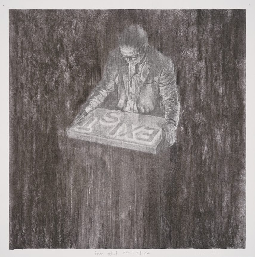 A realizmus és a figuratívitás talaján mozgó művész kompozíciói valóságon túli, szürreális hatást keltenek. Ezt bizonyítja legutóbbi, A kétely és csodálkozás bősége (2021) című kiállítása, amelyen ijesztően groteszk lényeket, szellemszerű alakokat, fénylő objektumokat, izzó gömbformákat láthattunk. Mostani rajzain már csak fekete-fehérségükből következően sem lehet erről szó, a képeken megjelenő alakok, emberi torzók, objektumok valóságosabbnak hatnak. Valódibbak, ám a mögöttük kibontakozó elmosódott tér, a tárgyakkal történő szokatlan interakció (kockában álló kislány virággal, szájában fonatszerű képződményt „tartó” arc) jól mutatja a tárlat szürreális mivoltát.