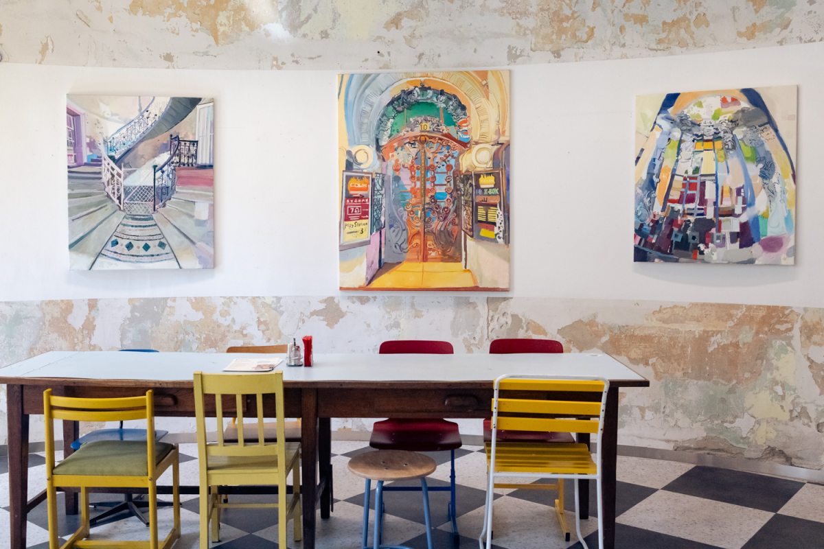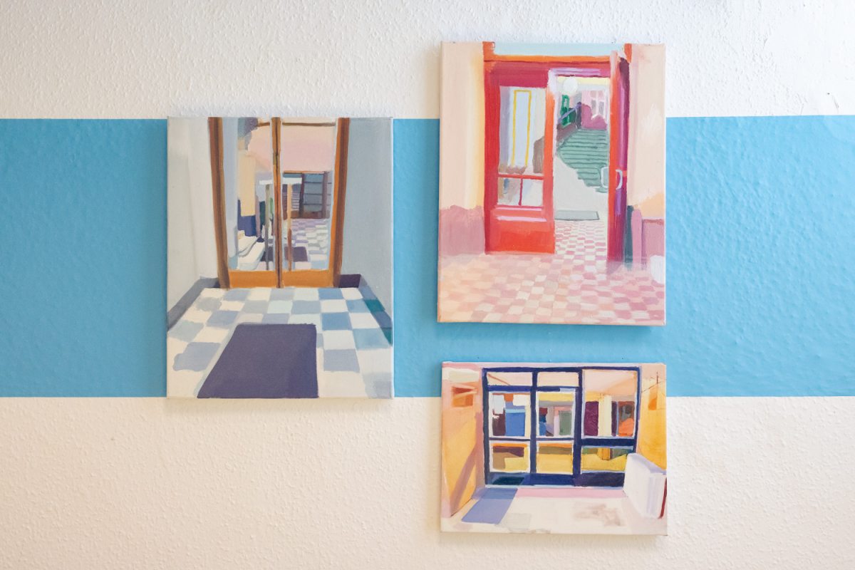 Merényi Dávid korábbi kompozíciói sem csupán a városi terek vizuális dokumentációi: nála a kapualjak, lépcsőházak, belső udvarok sosem csak építészeti részletek, hanem érzelmi tájak is, amelyek arra emlékeztetnek, hogy hétköznapjaink banális helyszínei, amelyeken sokszor csak sietve végigszaladunk, olyan szépségeket hordoznak, amelyek miatt érdemes lenne lelassulni, megállni, rácsodálkozni. Merényi festészete azonban most elmozdul a lírai ábrázolás felől az emelkedettebb, konceptuálisabb sík felé: az ezeken a képeken megelevenedő, a valóságból merített, ám különféle festői eszközökkel torzított és deformált kapualjak, lépcsőházak és belső udvarok itt sem csupán építészeti terek, hanem letűnt, elfeledett világ szimbólumai.