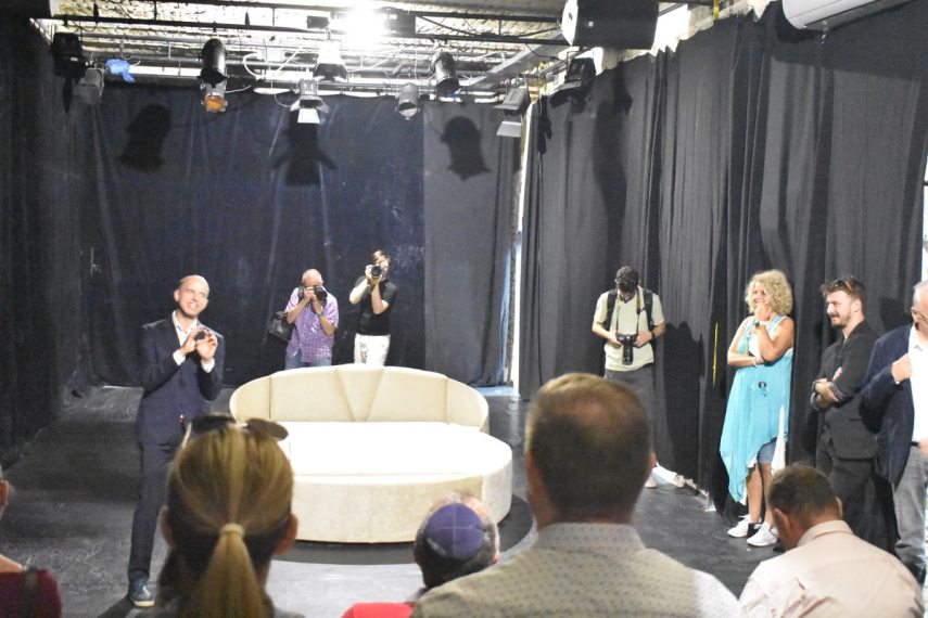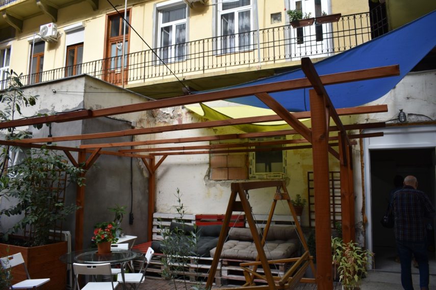 Borgula András büszkén mutatta be a színház épületének minden zegzugát. A társulat maga is tevékenyen részt vett a bontási és az építési munkálatokban. Megnéztük a 99 főt befogadó nézőteret és színpadot, a kicsiny öltözőt, az irodát, amely egyben társalgó, a kelléktárat és az udvaron kialakított, a ház lakói számára is nyitott pihenőt.