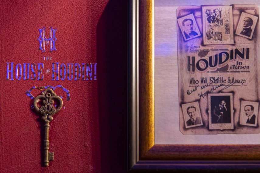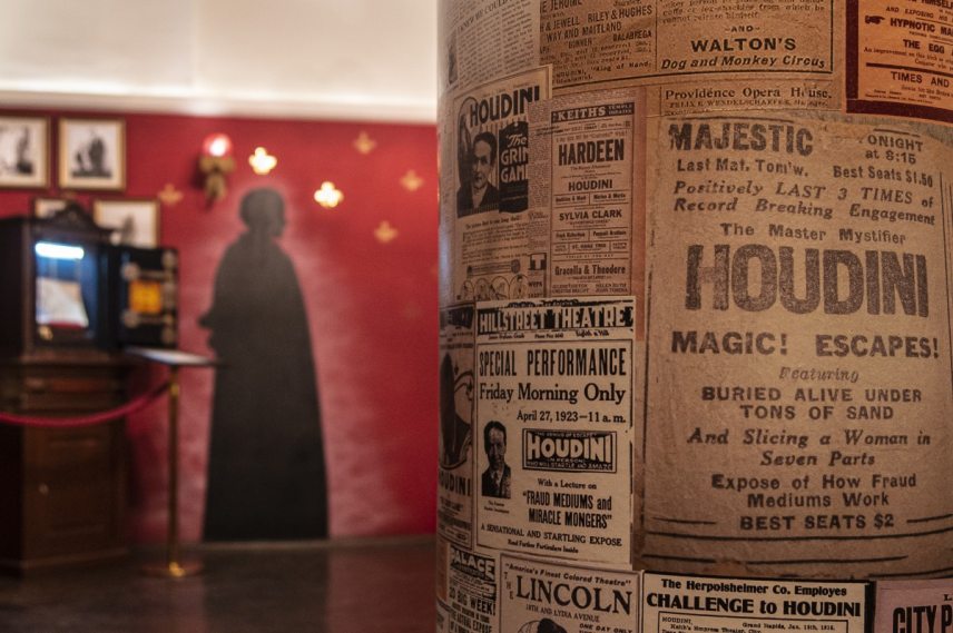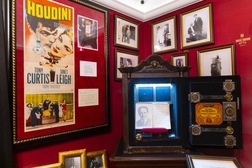 Azután belépünk az emlékhely előterébe, s kicsit olyan érzésünk támad, mintha valami időcsapdába kerültünk volna. A Houdini-ház évszázados időutazásra hív. A jegypénztár mintha egy amerikai bank kasszája lenne az 1920-as évekből, a sarokban páncélszekrény, a falakon plakátok. Igazi cirkuszi hangulat. A bejárat mellett maga a nagy Houdini áll megbilincselve, ketrecbe zárva, alig várja, hogy megmutassa a csodát, a lehetetlenből szabaduló képtelen varázslatot. Persze a viaszbábu csak díszlet, a valódi csoda akkor kezdődik, ha belépünk a kiállítótérbe.