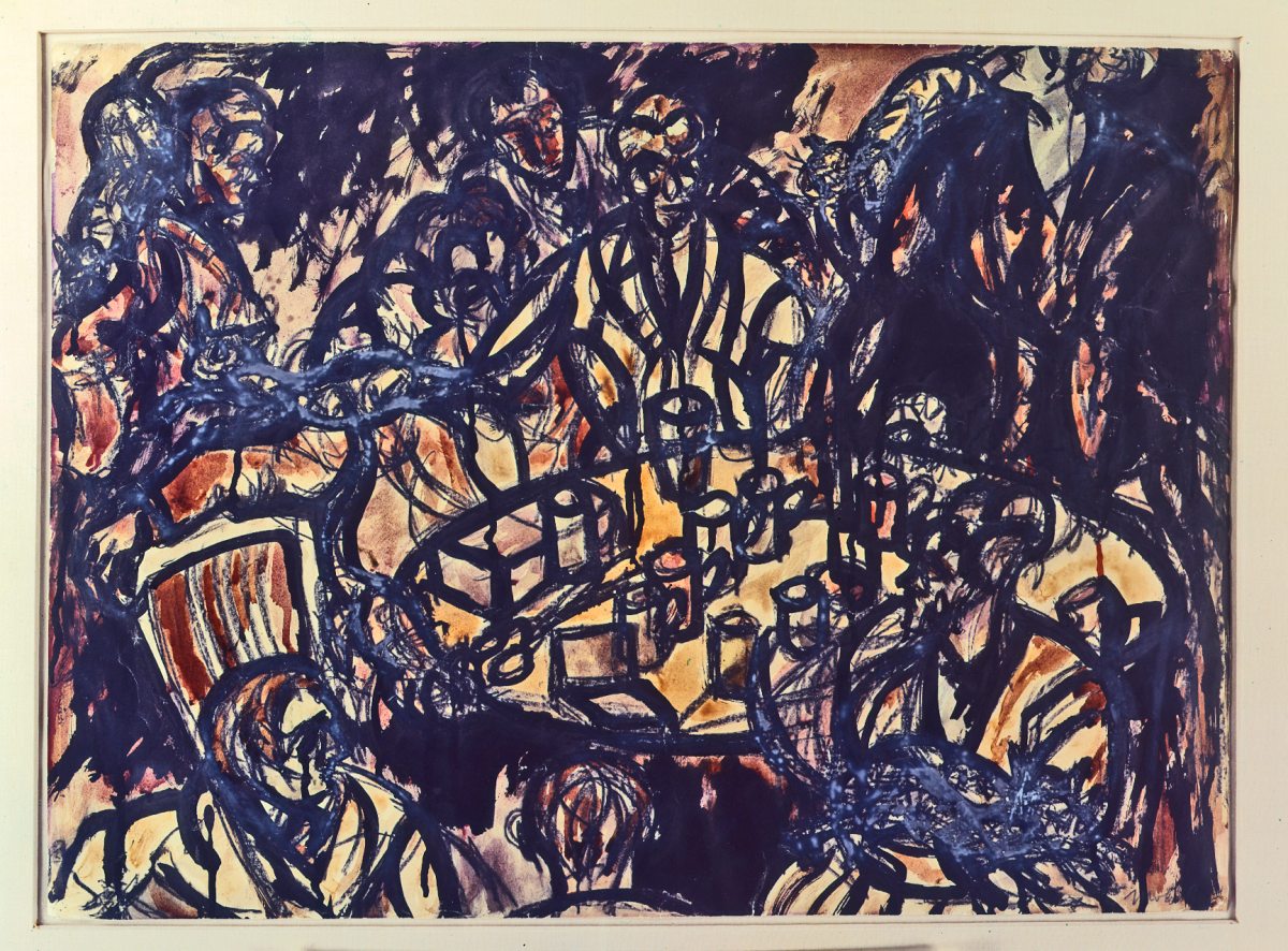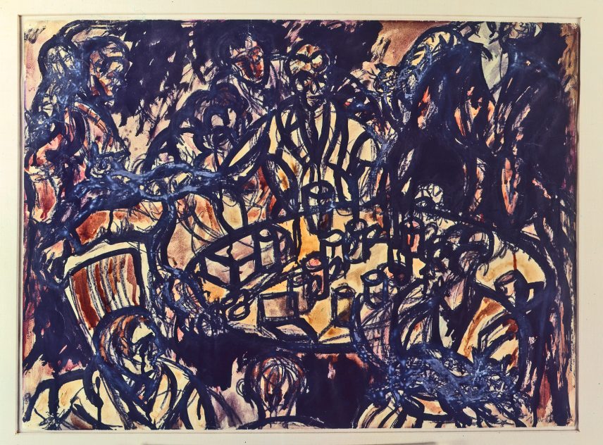 Ez az akvarell Moholy korai korszakát jelzi. Sűrű, nehezen kivehető, gazdag vonalrendszerből építkező kompozíciókat készített ekkoriban, amelyek a háborús zűrzavar allegóriáiként is olvashatók. A kavargó, hálószerűn épülő, összekapaszkodó kontúrokból szinte alig kivehetők a figurális részletek, amelyek egy konkrét jelenetet ábrázolnak: több figura ül körül egy asztalt, amelyen poharak és egyéb szögletes tárgyak láthatók. Feltehetően beszélgetés zajlik az asztalnál, miközben a háttér expresszív részei és a tintafoltok a kontextust is bizonytalanná teszik. Izgalmas a mű figurális részleteinek a kontúrossága és transzparenciája.