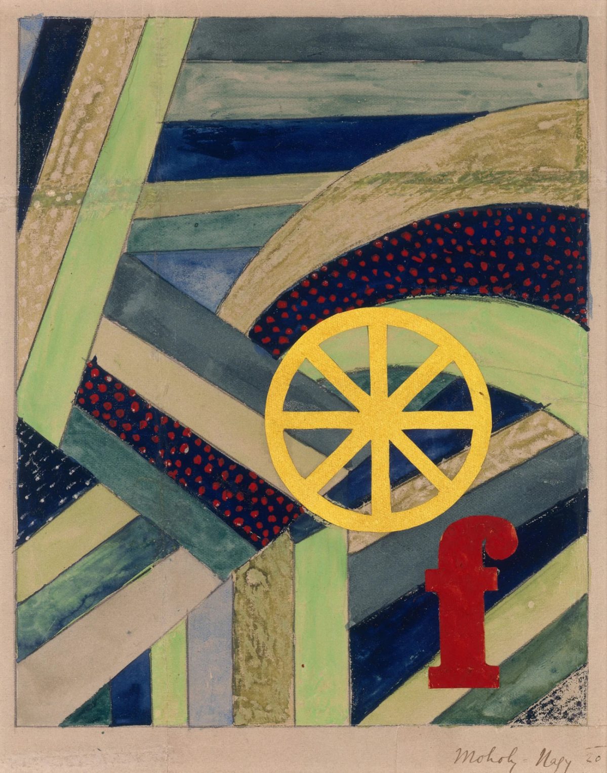 Moholy-Nagy ebben a korai időszakban számos olyan művet is készített, amelyen a képmezőt különféle síkokra osztotta, azokat pedig párhuzamosan futó, eltérő színű vagy mintájú mezőkre szabdalta. Ez a gouache technikával megalkotott kollázs is ilyen, amelynek a játékossága és a ritmusossága adja az izgalmát. Az egymásba kapcsolódó sávok rétegzetté teszik a képet és adnak neki egyfajta térérzetet, míg a piros színű F és a sárga kerék motívuma visszarántja a képet a síkba, és az egyes elemek ornamentikusságát hangsúlyozzák.