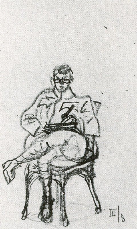 Moholy-Nagy az első világháborús lövészárokban kuporogva küldözgette barátainak azokat a hivatalos tábori postai levelezőlapra alkotott ceruzarajzait, amelyek egy rendhagyó karrier tétova kezdőlépéseit jelentik. A levelezőlapok a rajtuk található rajzokkal megörökítették teljes katonai pályafutását. A fenti képen katonaként, nyugodt pózban ábrázolja magát, a lap alsó szélén levő számozásból pedig pontosan lehet következtetni arra, hogy ez az időszak már a budapesti kórházakban lábadozást követő nyugodalmas szakasz, amikor kiképzőtisztként sokat utazik, ezalatt pedig számos művésszel is találkozik.