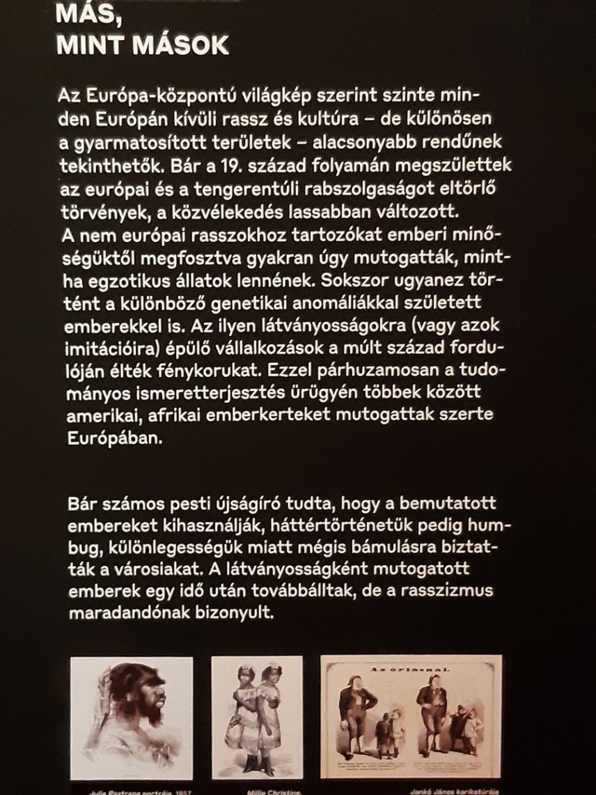 De haladjunk tovább, s álljunk meg mondjuk az emberseregleteket hirdető plakátok előtt! Hát igen, manapság meglepődünk azon, hogy a 19. században úgy mutogatták a négereket, sárgákat és mindenféle más egzotikus népeket, mint az állatokat, de akkoriban az ilyen embertelen mutatványok sem csak alantas szórakozást kínáltak, hanem antropológiai ismereteket is adtak.