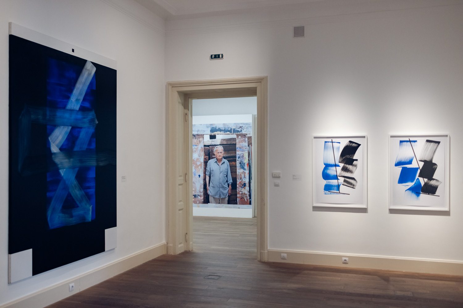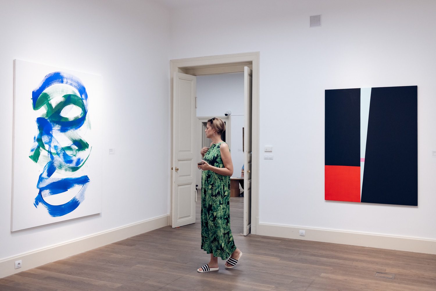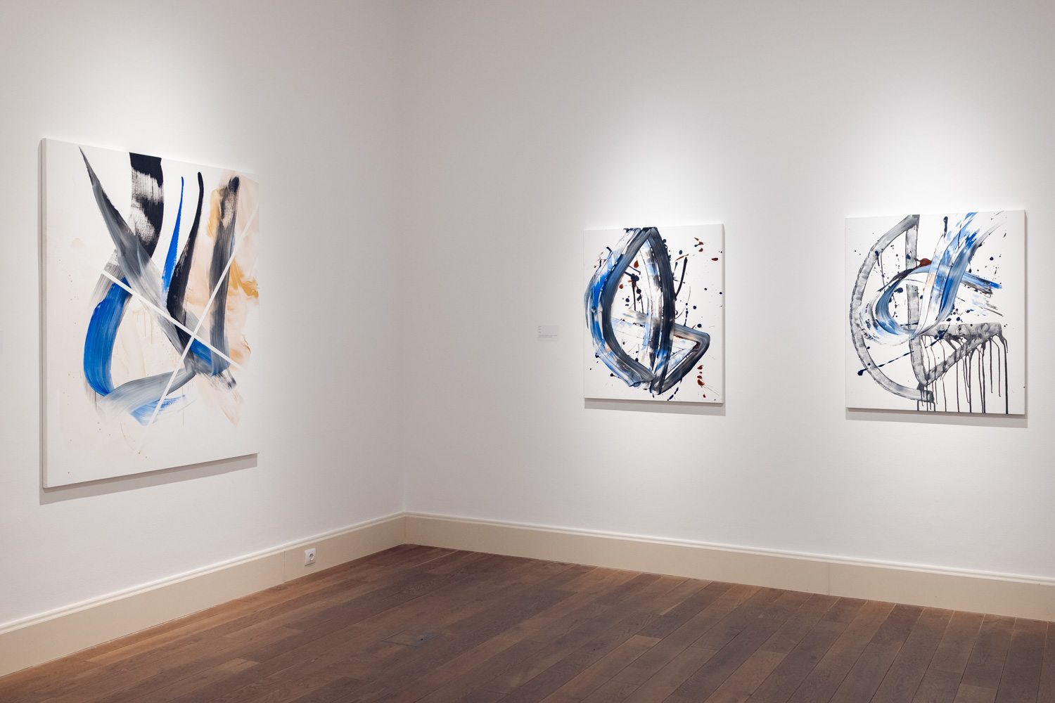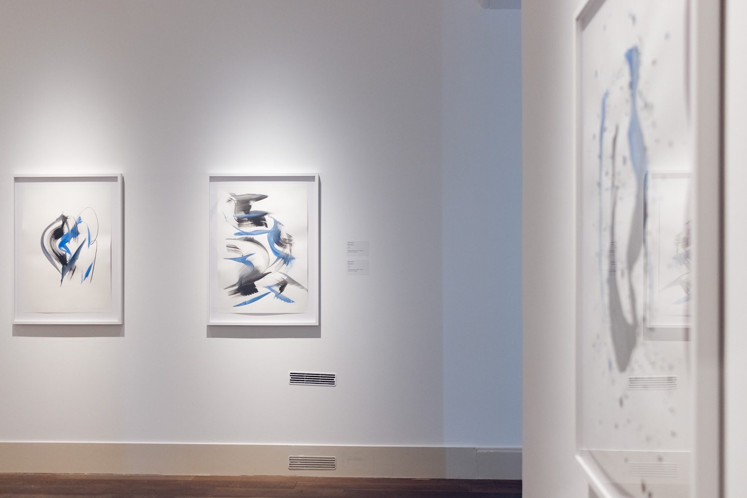 A kiállítás első termében az 1990-es évek végén és a 2000-es évek elején készült képek szerepelnek, amelyekben Nádler a meditáció és a festői gesztus kapcsolatát kutatta. Ezeken a képeken az áthatolhatatlan fekete és az oldottabb kékek lépnek kapcsolatba. Nyitott, végtelen, nem materiális síkok rezonálnak egymással. A széles gesztusok érzékiségéből és a geometrikus formák szigorú rendjéből épülnek e művek, a kompozíciókban a mozdulat és a kontroll folyamatos párbeszédet folytatnak egymással. A nagy vásznakon megjelenő inga motívuma a közép, az egyensúly keresésének metaforájává válik: egyszerre idézi a fizikai folyamatot és a belső lelki gyakorlatot. Ebben az időszakban a rezonancia a harmónia keresését jelenti: a fekete és a fehér, a rend és a gesztus, a nyugalom és a feszültség dinamikus egyensúlyát, amely a képek érzékiségében bontakozik ki.
