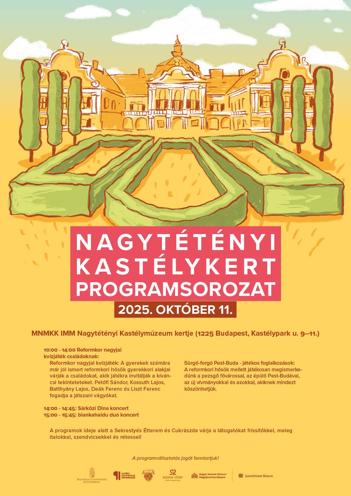 Szeptember 27-én, az újranyitott nagytétényi kastélyban az MNMKK tagintézményei múzeumpedagógiai programokkal várják az érdeklődőket, a Póka Egon Művészeti Akadémia növendékei pedig akusztikus koncertet adnak. A kínálatot a Tétényi Polgári Kör programjai színesítik.