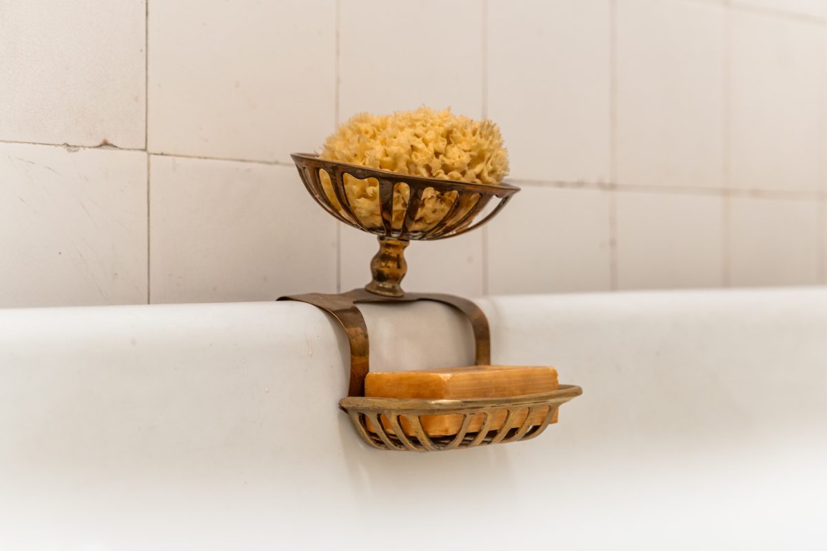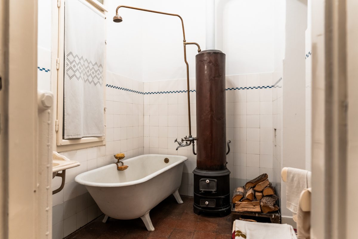Kályha, mellette egy kosár fa, kád, oldalán szivacs és szappan, mosdókagyló, fölötte polcon körömkefe, fésű – még ha jelképes is a berendezés, egyértelmű, hogy az otthonosság helyett a funkció számított a fürdőszoba kialakításánál. Látszólag kakukktojás a vasaló, hiszen nem itt vasaltak, de volt, hogy az eszközt a kályhán melegítették. A radiátor a kor eszközeinek párhuzamosságait, a különböző technikai fejlettségi szintek egymás melletti létezését mutatja, hiszen gondoljunk csak bele, a kályha nem csupán a vizet, de a helyiséget is melegítette.