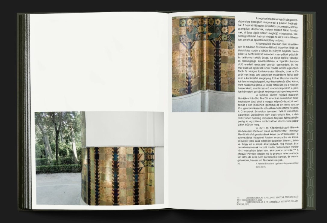 Ezt a kötetet is – a Velencéről szóló kis könyvemhez hasonlóan – Juhász Veronika grafikus (Projectroom) tervezte. Úgy gondolom, hogy Verának ismét sikerült megtalálnia a tartalom és a forma összhangját. Nagyon jó volt vele együtt dolgozni. Érzékét és grafikusi viszonyulását a témához jól jelzi, hogy az előzéklapokhoz és fejezetelválasztó oldalakhoz Maróti Géza jellegzetes motívumainak újraértelmezésével egyedi mintákat tervezett, amelyeken – a pavilon eozinmázas Zsolnay-csempéire reflektálva – finoman megcsillan a fény.