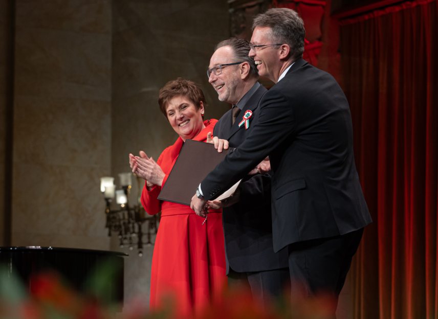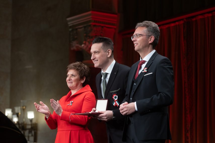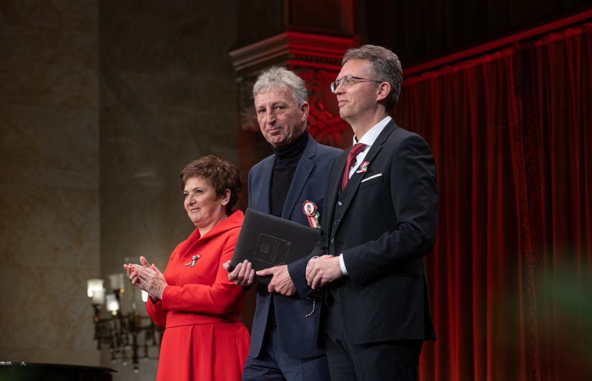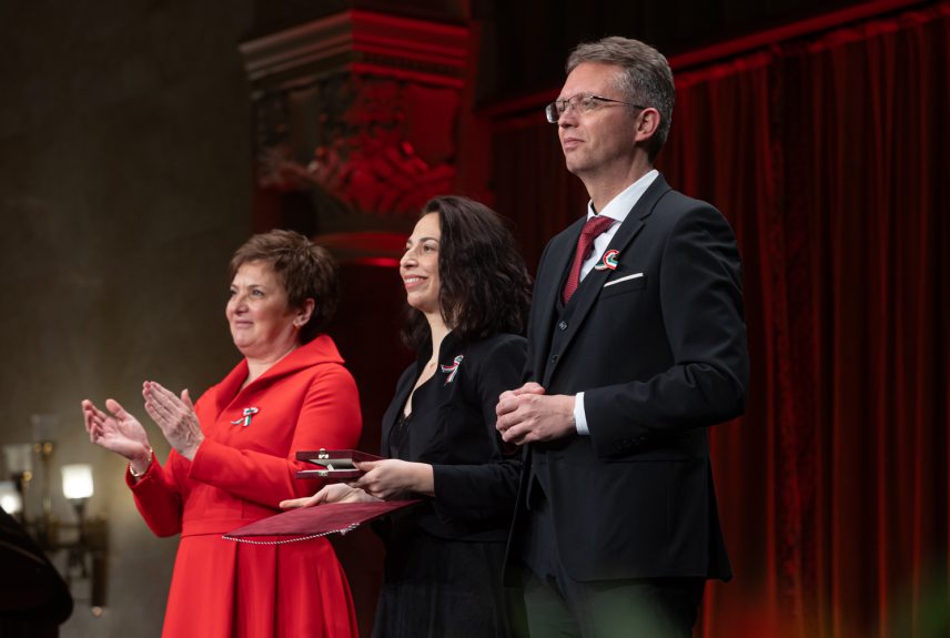 Hankó Balázs kultúráért és innovációért felelős miniszter, dr. Varga-Bajusz Veronika, a Kulturális és Innovációs Minisztérium felsőoktatásért, szak- és felnőttképzésért, fiatalokért felelős államtitkára, valamint Závogyán Magdolna, a minisztérium kultúráért felelős államtitkára a március 15-i nemzeti ünnep alkalmából kitüntetéseket adtak át a Pesti Vigadóban.