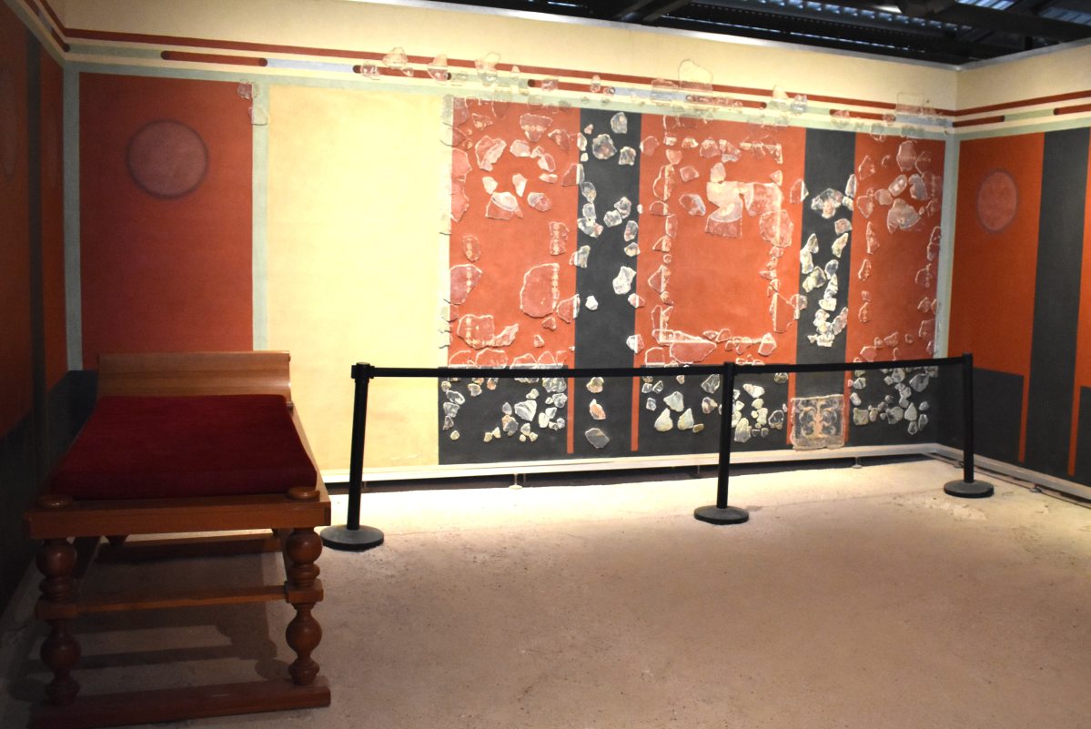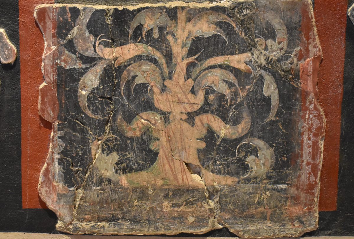 A falakat mitológiai figurák, növényi és állati minták díszítették. A feltárások során előkerült falmaradványok a különböző korok eltérő festési technikáiról árulkodnak. Fehér és fekete alapra egyaránt készültek falfestmények.