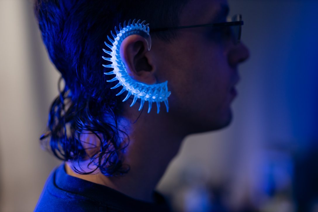 Kiss Balázs: Digitális tárgyalkotás szakon, ami itthon viszonylag újnak számít. Saját ékszermárkám van: testtel kapcsolatos installációkat, kvázi protéziseket és egyedi ékszereket készítek. Amikor a dress-codingosok megkerestek, és bekapcsolódtam a munkába, az alanyok és a gyártók oldaláról közelítettem meg a feladatot. Beleástam magam az auditológiába, és meglátogattunk egy hallókészülék-gyártó céget. Hallásban korlátozott emberekkel interjúztunk, és beszélgetést szerveztünk a műhelyemben a Halitali, vagyis a hallássérültek közössége önszerveződő csapatával. Rendkívül nyitottnak bizonyultak az ékszer ötletével kapcsolatban. Sokat segítettek az előkészítési folyamatban. Jó érzés volt úgy nekikezdenem a tervezésnek, hogy bőven volt input arra vonatkozóan, egyáltalán milyen kérdéseket vet fel a hallókészülék viselése, milyen formái vannak, ki hogyan éli meg a dolgot, és melyek a kérdés szubjektív, valamint társadalmi összefüggései.