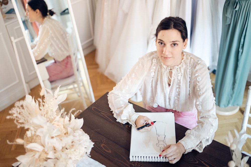 Először mindenkitől inspirációs képeket kérek: hol lesz az esküvő, a lagzi, nagyjából mit képzeltek el. Megfigyelem őket, milyen emberek, hogyan beszélnek: cserfesek-e vagy inkább visszahúzódóak. Átbeszéljük, hogy az elképzeléseik közül mi az, amihez ragaszkodnak. Látom az alakjukat, és ők elmondják, hogy mit szeretnének leginkább hangsúlyozni. Nagyon fontos az esküvő napjának menetrendje, mert elsősorban praktikus szempontból közelítem meg a ruhákat. Átbeszéljük az anyagokra, a bélésekre, a technikákra vonatkozó részleteket, és a végén már látom is magam előtt, hogy mit fogok lerajzolni.