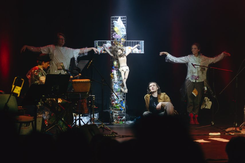 Az előadást a Színház- és Filmművészeti Egyetem ötödéves hallgatói vitték színre Lukács Ádám rendezésében, Vecsei H. Miklós konzulensi közreműködésével. A produkció egyik különlegessége a zenei műfajok merész vegyítése volt – a gospeltől a csujogatásig, sőt helyenként meglepő fordulatokat is bevállalt – például Pilátus ítéletét a Paint it Black aláfestésével hallhattuk. A szöveg gazdagságát és játékosságát hűen tükrözte a színészhallgatók játéka, valamint a plasztikjelmezek és a kupakgyűjtőre hajazó keresztrácsozat, amelyet Jézus tölt meg a fogyasztói társadalom kacatjaival, amikor kiűzi a templomból a kereskedőket és pénzváltókat.