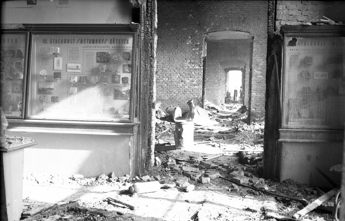 A szabadságharc idején keletkezett tüzekben a Föld- és Őslénytár mintegy 140 ezer leltári tételes gyűjteményének 80 százaléka megsemmisült, több száz kéziratos földtani térkép lett oda, elpusztult a rendkívül értékes, 18. századi alapműveket tartalmazó könyvtár, elégtek a tárak mikroszkópjai, műszerei, leltárkönyvei, több kutató elkészült dolgozatának kézirata is a tűz martalékává vált. Az Ásványtár esetében csak a kiállítás vitrinjeiben és az alattuk lévő fiókokban tárolt ásványok vészelték át lényegében sértetlenül a katasztrófát, a 200 ezer tételből álló gyűjtemény 80 százaléka megsemmisült. „Az Ásványtár és az Őslénytár gyűjteményében keletkezett kárt 200, illetve 80 millió forintra, mai értéken mintegy tíz-, illetve négymilliárd forintra becsülték. E számok nyilvánvalóan csak elméleti jelentőségűek, hiszen a gyűjtemények szó szerint felbecsülhetetlen értéket jelentettek (egy másik korabeli számítás például az őslénytári anyagban okozott kárt 28 millió dollárra tette), azt azonban jól mutatják, hogy az ásványtári gyűjteményben sokkal nagyobb érték pusztult el, mint az őslénytáriban” – olvasható Papp Gábor 2016-ban publikált írásában.