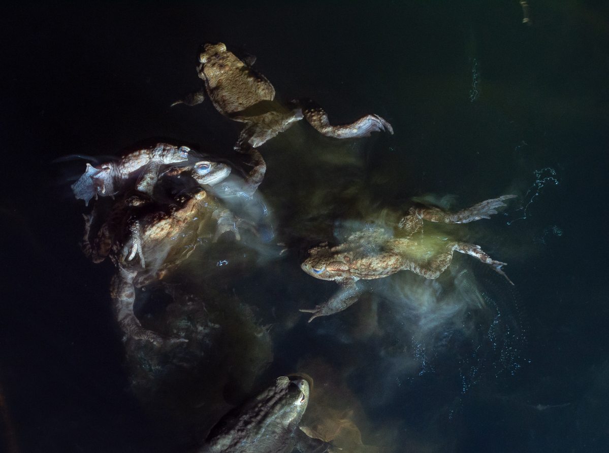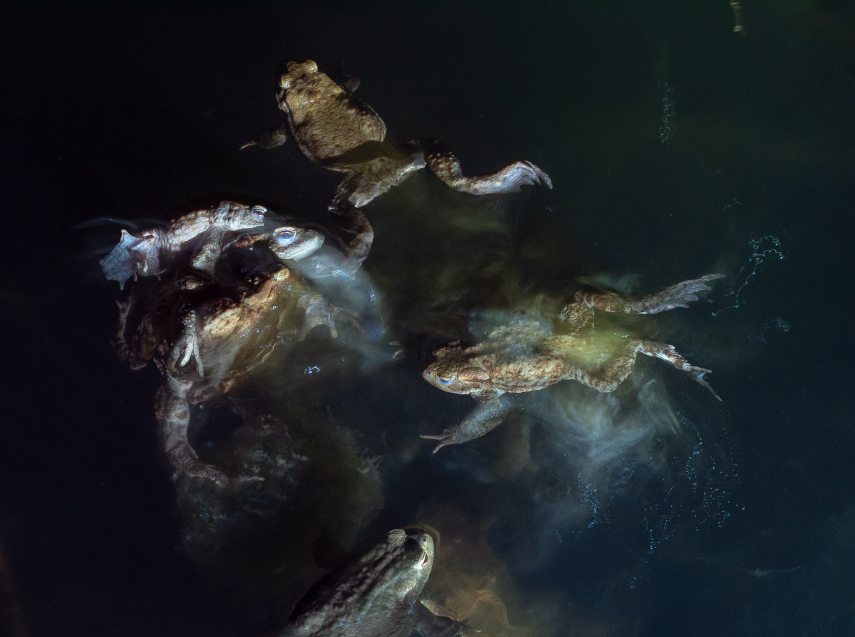 A természetben ritkán látni ennyire hangos és kavargó szerelmi életet, mint amit a barna varangyok művelnek tavasszal a Börzsöny lábánál, a Bajdázói-tónál, ahová tömegesen érkeznek márciusban szaporodni. Ez a kép, amelyet hosszú záridővel, zseblámpával megvilágítva, majd egy hirtelen vakuvillanással készítettem, pontosan azt a kaotikus energiát ragadja meg, amit ezek az amúgy csendes, föld alól előbújt élőlények ilyenkor produkálnak. A hímek felkapaszkodnak a nőstényekre, de gyakran bepróbálkozik egy második, harmadik példány is. A vízfelszín ilyenkor szinte fortyog: petefüzérek csavarodnak vízinövényekre, a hímek verekednek, a nőstények meg megpróbálnak kiszabadulni. Az egész mintha egy megrendezett béka-iszapbirkózás lenne.