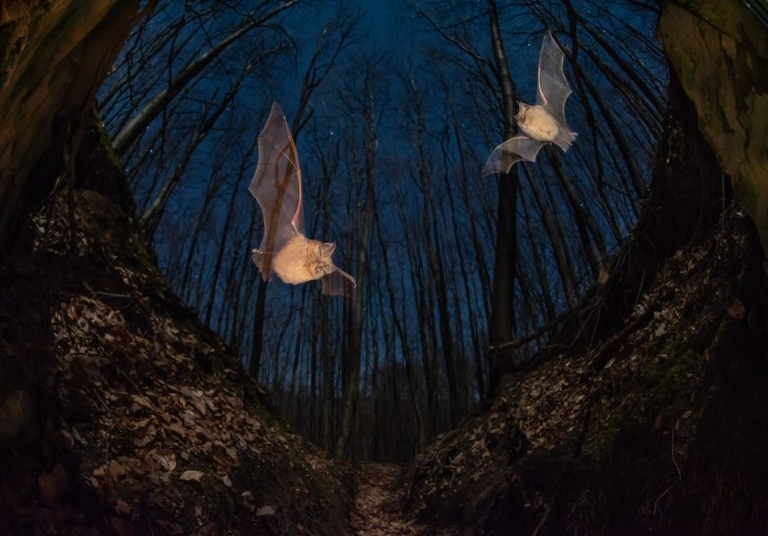 A börzsönyi Királyrét körül van tíz felhagyott vasércbánya, ezek közül néhány a nagyközönség számára is látogatható, másokat rácsos ajtó véd, hogy a denevérek biztonságos és zavartalan helyet találjanak maguknak, ahol hibernálódhatnak. A legtöbb faj ősztől tavaszig nem is jön ki a barlangokból, a patkós denevérek azonban néha-néha felébrednek, és kiugranak egy kis éjjeli vadászatra. Ezek a kis jószágok ugyanis nem bírják a teljes leállást, nincs elég vastag zsírrétegük hozzá. Melegkedvelő fajok, de a kutatók úgy látják, a klímaváltozás miatt egyre északabbra húzódnak, már Lengyelországban is megjelentek. A hőmérséklettől függően van, hogy csak pár percet, máskor akár órákat is kint töltenek a téli éjszakákon. Ez a kép mozgásérzékelős rendszerrel, vakukkal, halszemoptikával készült, látványos holdfényben. Mindent előre beállítottam, majd csendben távoztam, reggelre pedig elkészült a fotó. A két kis patkós denevér éppen visszahúzódott a bányajáratba, amikor az egyikük beindította a rendszert, miközben a másik éppen ott repült mellette. Mintha csak összebeszéltek volna a jó kép érdekében.