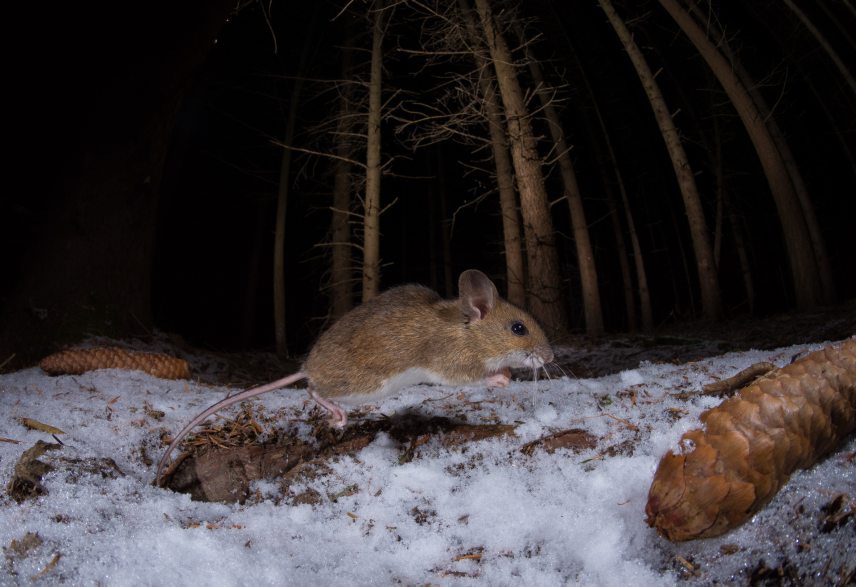 Egyidőben gyakran fotóztam erdei egereket, főleg télen, amikor más, izgalmasabb témát nem találtam. Ennél a képnél ugyanazt a mozgásérzékelős technikát vetettem be, amelyet korábban a denevéreknél is használtam, csak itt a szenzort a földre tettem, közvetlenül az egér üregének bejárata mellé. A fényképezőgépet és a vakukat szépen elrendeztem, a csali táplálékot pedig a talajon heverő tobozok mögé rejtettem. Az állatka hamar megszokta a felszerelést, sőt, néha már akkor kikukucskált, amikor még állítgattam a technikát. Ezek a házi egérnél alig nagyobb erdei egerek nem különösebben félénkek, főleg, ha finom menü, például szalonna, szotyola is kerül az „asztalukra”. Igazi tornászok, és annyira fürgék, hogy emberi reakcióval nem is lehetne követni őket. A vaku viszont segített kimerevíteni azt a pillanatot, amikor az egyikük éppen kiugrott az üregéből, így meglett az a szökkenés, amelyet szabad szemmel soha nem láthatnánk.
