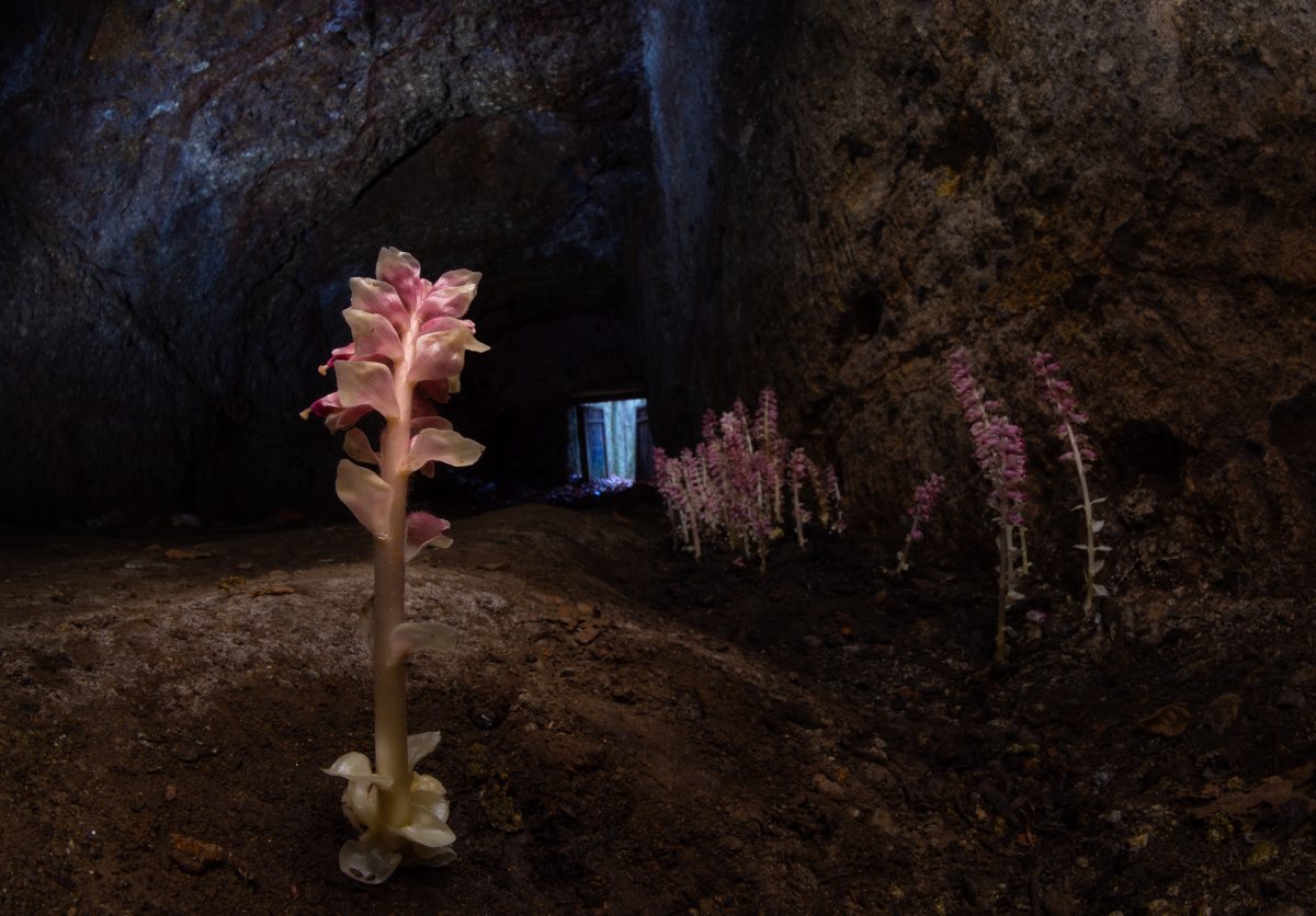 Van egy növény, amely úgy néz ki, mintha mindig rossz napja lenne: ez a kónya vicsorgó. Érdekes egy növény, nincs zöld levele, nem fotoszintetizál, nem érdeklik a nap sugarai. Helyette egyszerűen rácsatlakozik a közeli fák gyökérzetére – ebben az esetben valószínűleg egy gyertyánéra –, és onnan szívja el a vizet, tápanyagot. Parazita növény, de nagyon is fotogén. Ezt a képet még tavaly áprilisban fotóztam, az egyik felhagyott vasércbányában. A növényeket minden irányból vakuztam, hogy kiemeljem őket a félhomályból, a háttérben a bánya bejárata látszik: onnan szűrődik be az alkonyi fény, halvány, kékes derengéssel. Az volt a koncepcióm, hogy bemutassam, milyen egy föld alatti, természetellenesen természetes élőhely. Ez a kettősség – a mesterséges megvilágítás és a természetesen beszűrődő fény – adja a kép különös atmoszféráját.