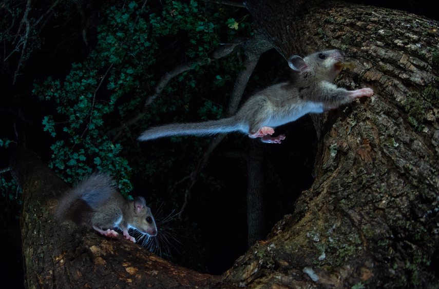Évek óta figyeltem már a mozgásukat az éjszakai túráim alatt, és egyszer elhatároztam, hogy megpróbálom őket fent, a faágak között lefotózni. Negyvenkét estén keresztül fényképeztem, ez a kép a negyvenegyediken sikerült. A technika itt sem volt egyszerű: a halszemoptikás gépet állványra rögzítettem, felkötöztem a fára, négy különböző irányból helyeztem el a vakukat, és mozgásérzékelőt is használtam, miközben sokszor én is nyomogattam a gombot. Minden este gyümölccsel csalogattam őket, így próbáltam meg az odújuk és az etető közötti úton az ugrásaik irányát minél pontosabban kiszámítani.