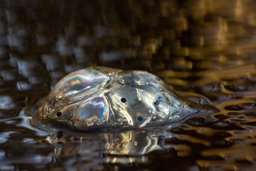 Egy börzsönyi dagonyában készült ez a kép, ahol a gyepi és erdei békák szaporodási eseményének lehettem szemtanúja. Ezek az állatok nem a nagy tavakat keresik, inkább a keréknyomokat, a kisebb vízállásokat kedvelik, ahol biztonságosan lerakhatják petecsomóikat. A képen egy ilyen kocsonyás csomó látható, benne a fekete pontok a jövő kis békái. A márciusi naplemente fénye, ahogy sütött be a kopasz fák között, pont megvilágította ezt a kocsonyás dombocskát, ami mintha egy felszínre emelkedő béka fejét formázná. Óvatosan begázoltam a petecsomók közé, hogy megörökítsem ezt a pillanatot. A petékből néhány hét alatt fejlődnek ki az ebihalak – ha addig ki nem szárad a víz, vagy át nem megy rajtuk egy erdészeti gép –, amelyek életük kezdetén a kocsonyás anyagból táplálkoznak.