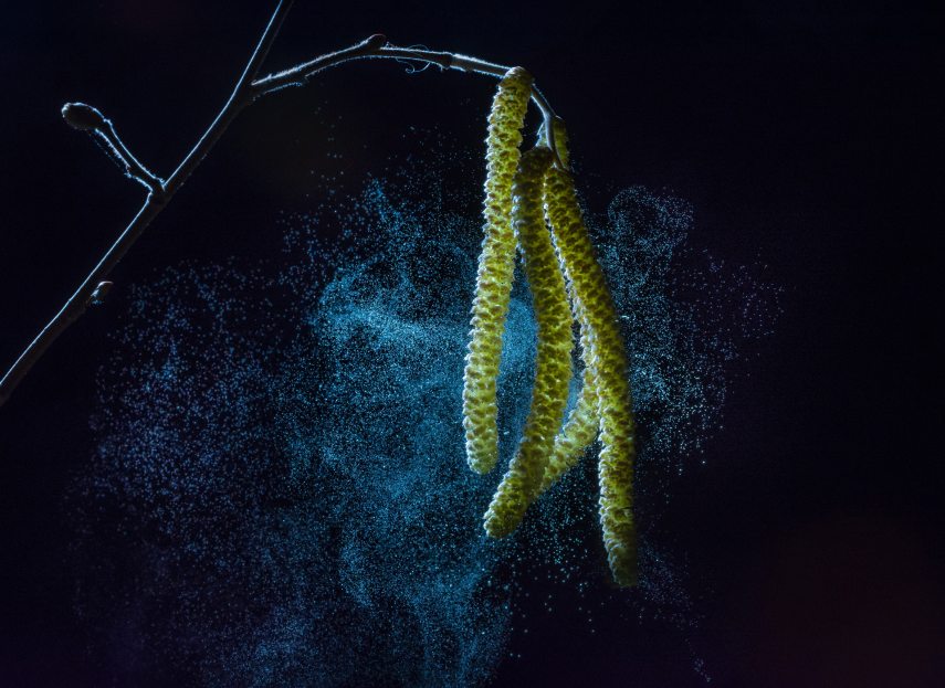 Ezen a fotón a közönséges mogyoró barkavirágzatának finom pollenjeit örökítettem meg egy februári este, a Börzsöny egy védettebb zugában. A mogyoró akár már januárban is elkezdheti a tavaszt, ha olyan az időjárás és jellemzően a szél fújja ki a polleneket a virágzatból. Ennél a képnél viszont egy kicsit én is rásegítettem: megráztam a bokrot, hogy minél látványosabb legyen a kompozíció. Az ellenfényes makrofotózásnak köszönhetően minden kis lebegő részecske láthatóvá vált, a vaku fényében megmerevedett ez a különös, szinte misztikus pillanat: mintha egy varázsló éppen csillagport szórna szét.