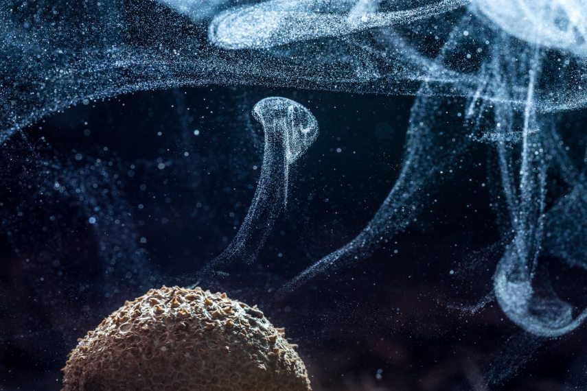Egy fenyveserdőben, a földön hasalva, közvetlen közelről készítettem ezt a fotót egy pár centis pöfeteggombáról. A pöfeteg, ha elérkezik az ideje, megreped és felnyílik, majd egy kis nyomásra – mondjuk egy lágy fuvallatra vagy akár az én óvatos érintésemre – füstfelhőként lövelli ki a spóráit. Ugyanolyan technikával készült ez a fotó is, mint amit a mogyorónál használtam, csak ezen a pollenek helyett a spórák járnak gomolygó szellemtáncot a magas Börzsönyből leszálló finom fuvallatokban.