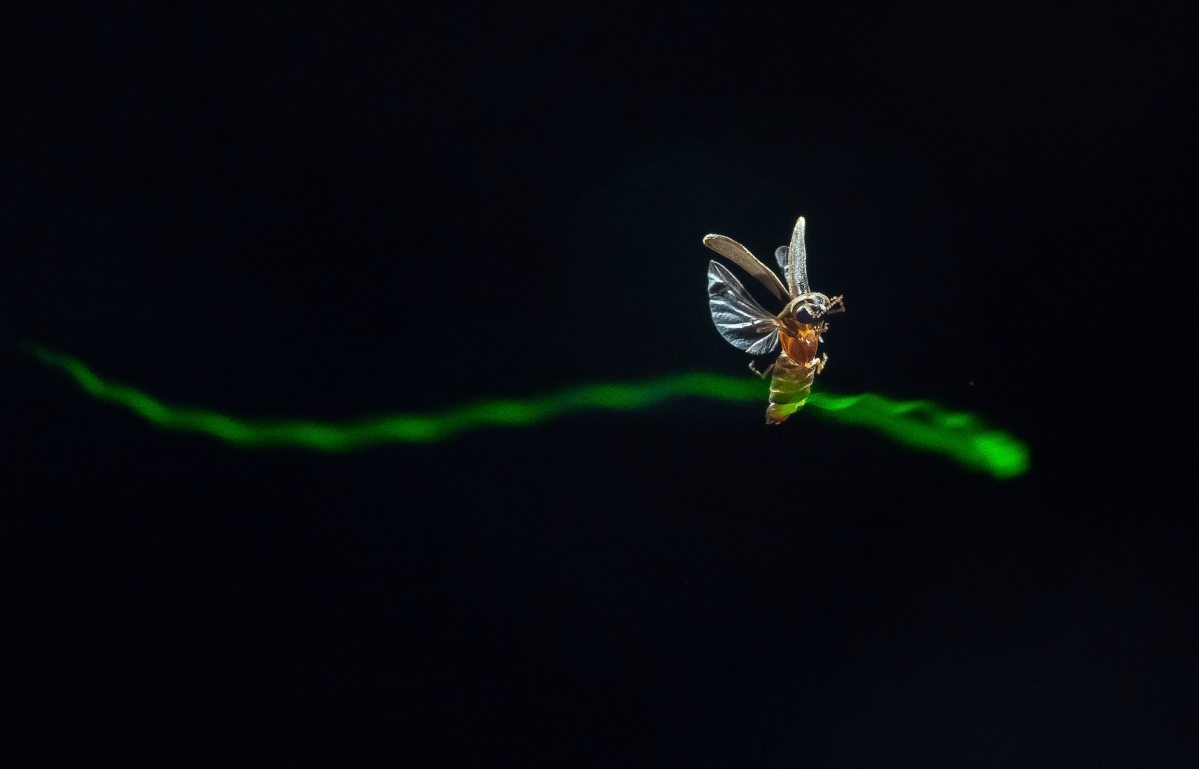 A fényképezésük viszont nem egyszerű. Szó szerint futkározok a bogarak után, és ha úgy érzem, elég közel kerültem egy példányhoz, villantok egyet. A hosszabb expozíció szépen kiadja a hím mozgását, miközben biolumineszcens zöld fénycsíkot húz maga után, míg maga a bogár a vakunak köszönhetően élesen látszik. Nagy kihívás őket fotózni, de amikor sikerül, az eredmény valóban mágikus.